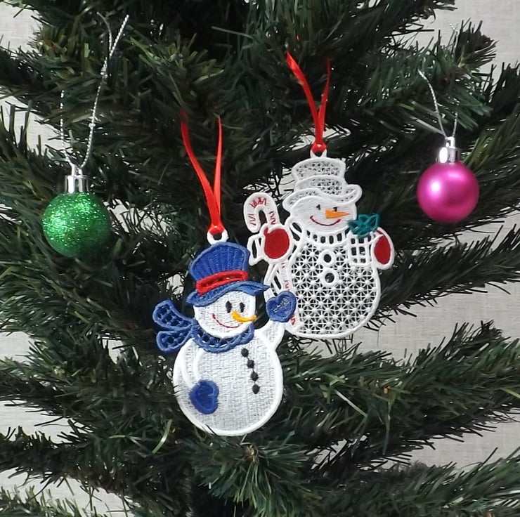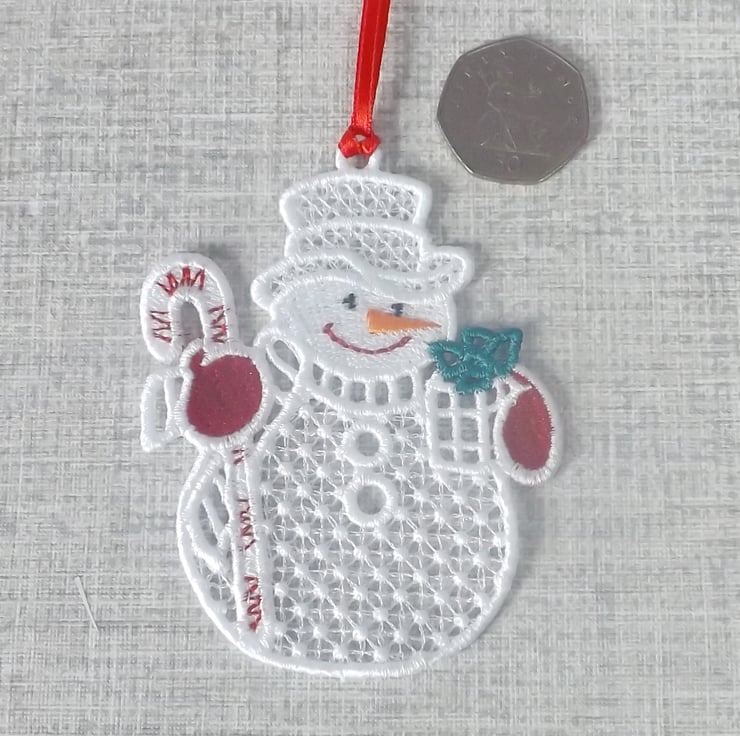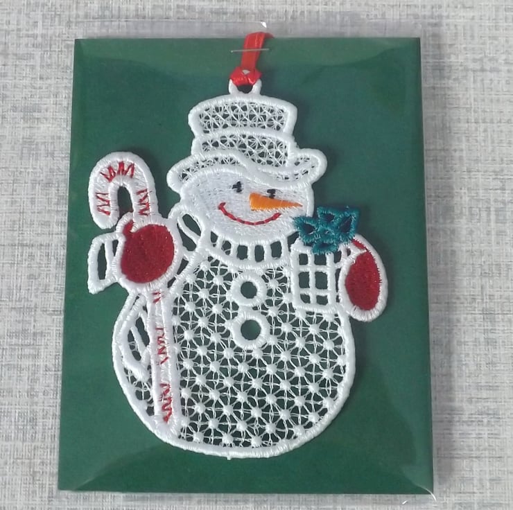 Embroidered lace snowman carrying a present, made from white rayon embroidery thread with various colours for accents.