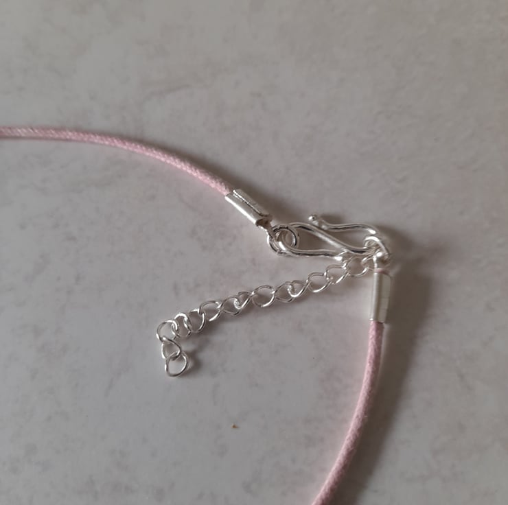 Beads measure 16mm and hang from a Pink waxed cord and closes with a silver plated S clasp