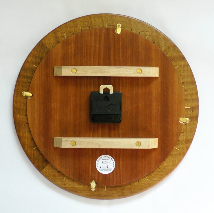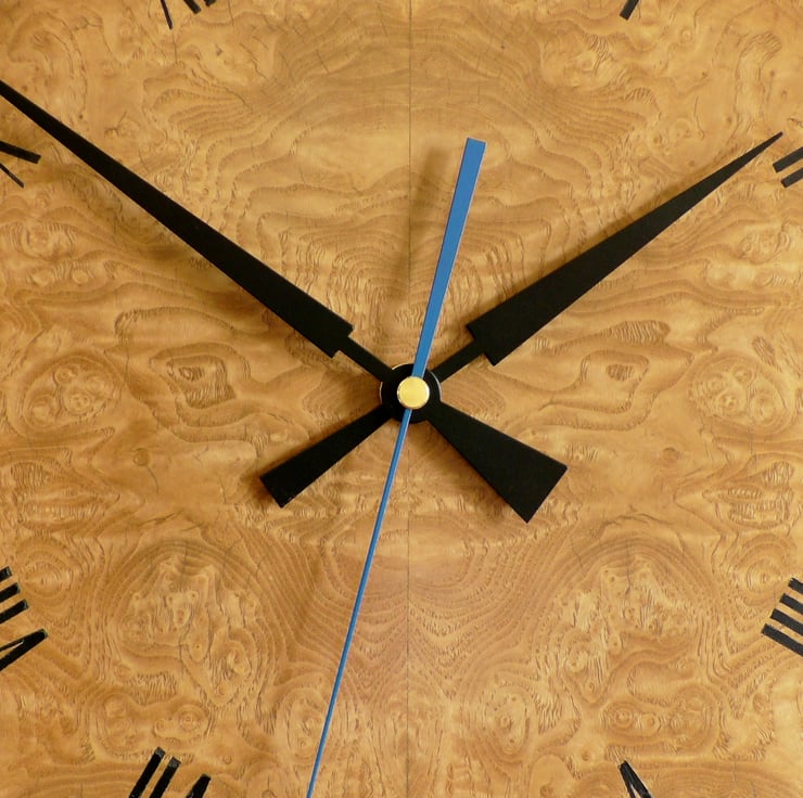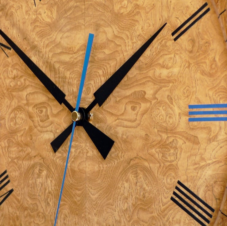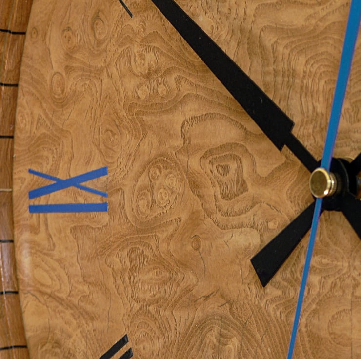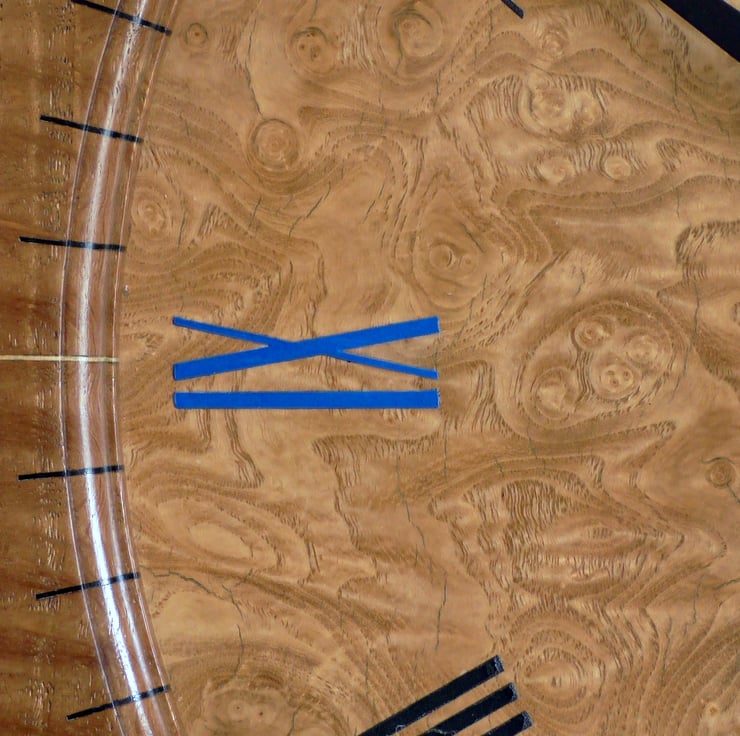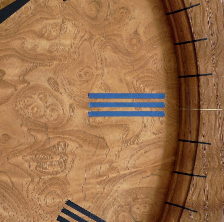 The Dial is veneered with book-matched burr ash with hand stencilled and embossed coloured Roman numerals that match the elegant ‘Pointer’ hands (ordered from Germany) which I sprayed black to contrast with the burr ash dial and match 8 of the Roman Numerals. A blue Seconds Hand matches the XII, III, VI and IX Numerals.