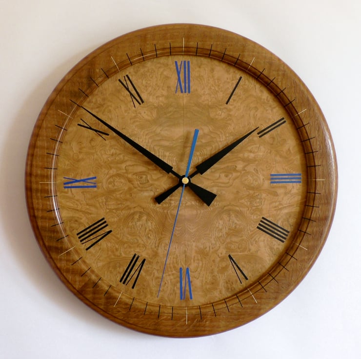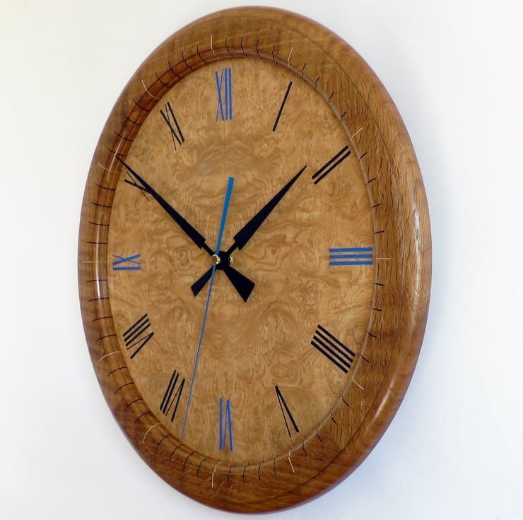 Designer made Wooden Wall Clock with a Burr Ash Dial and Inlaid Brown Oak Bezel