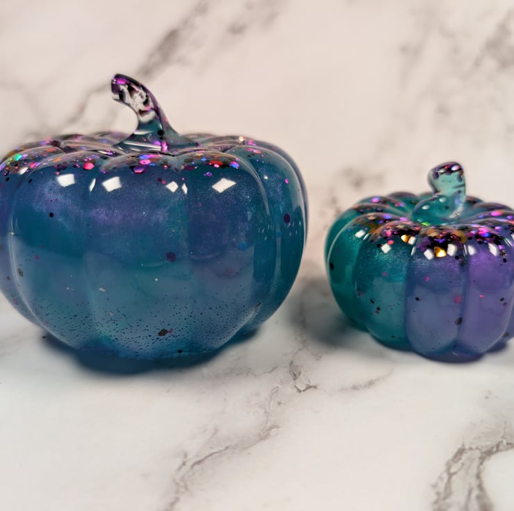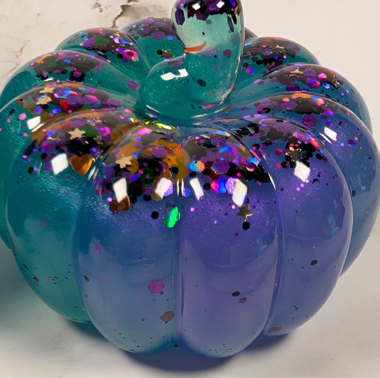 A modern twist on the classic pumpkin: this handmade resin jar and matching paperweight shimmer with green, violet, and glints of Halloween glitter, catching the light like a potion come to life.