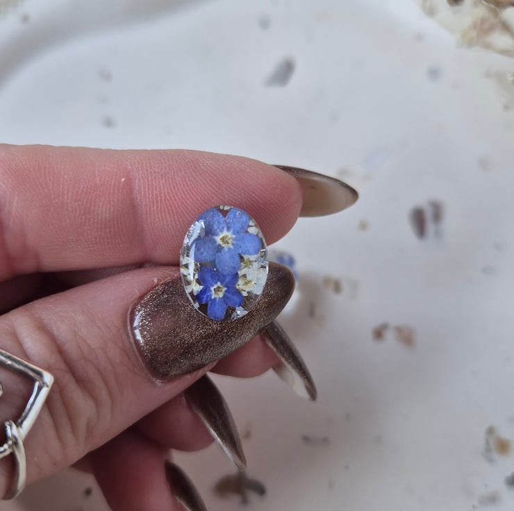Add a touch of nature’s beauty to your jewellery collection with these stunning oval shaped earrings, featuring delicate forget-me-not pressed flowers. Each one is lovingly handmade, making every pair completely unique — no two will ever be the same!