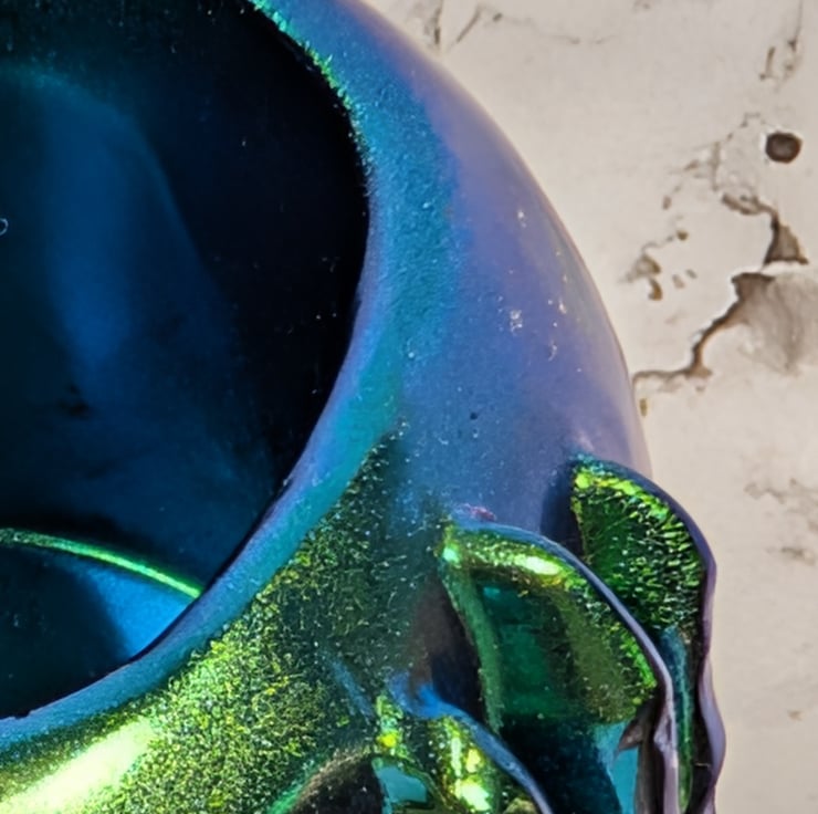 Each skull gleams with a high-shine chrome finish that changes hue in the light: purple, teal, gold, and green flickering like heat lightning across sculpted bone. Designed to hold LED tealights (included) or to stand proudly as bold statement décor.