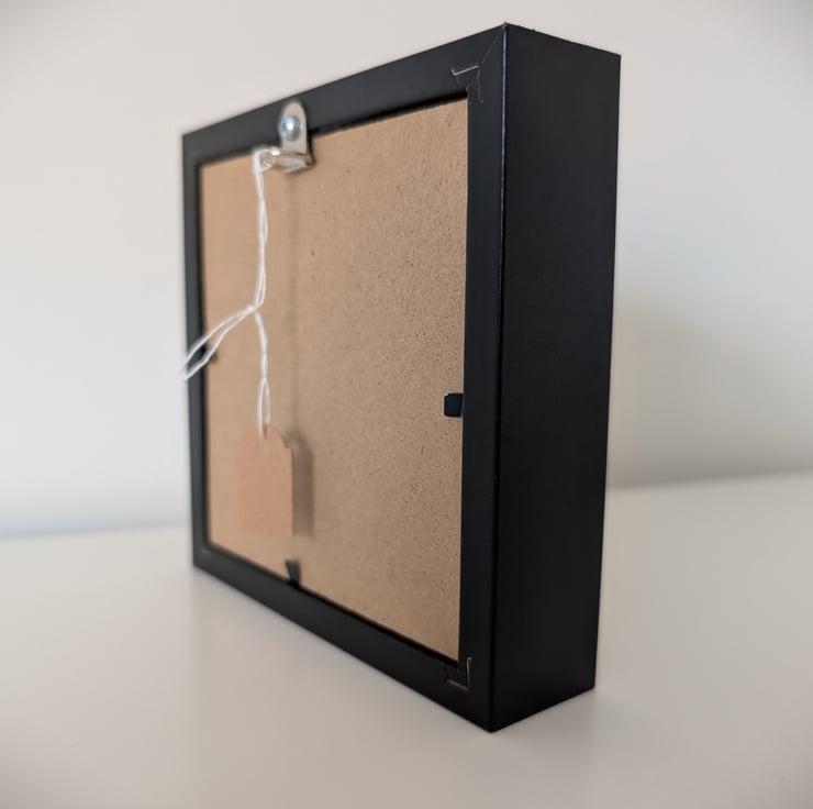 This painting was created in acrylics on a 5 x 5cm square stretched canvas before sealing with a gloss varnish and placed in a black shadow box frame. The overall size of the piece in its frame is 12 x 12cm.