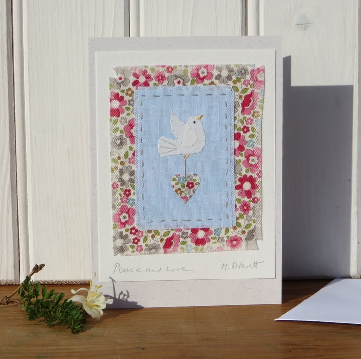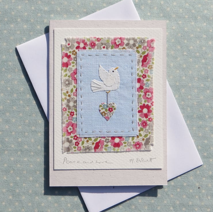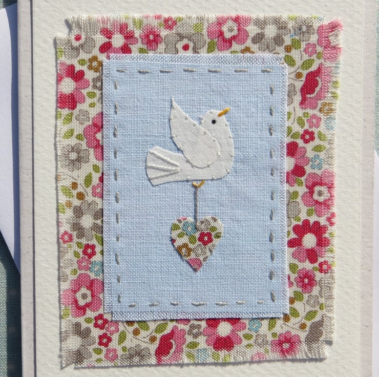 This little applique dove and heart design is made up of very pretty cotton print fabric teamed with a piece of recycled white cotton for the dove motif. Everything cut and stitched by hand to make a unique and lasting original piece of textile art. Perfect for new baby, first birthday, Christening or to go with baby shower gift. Suitable for weddings or engagement too!
