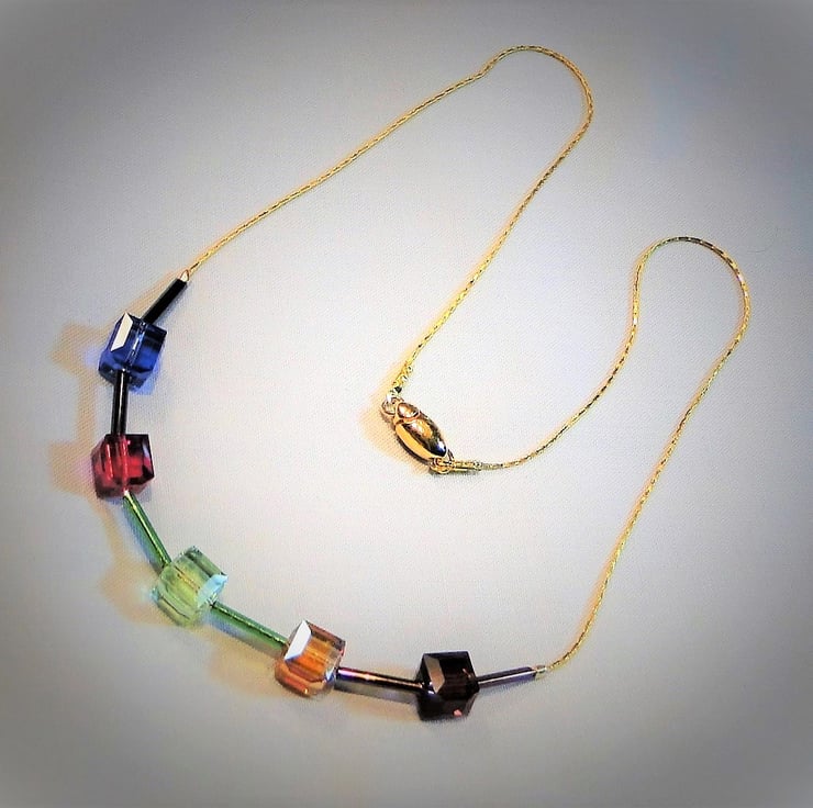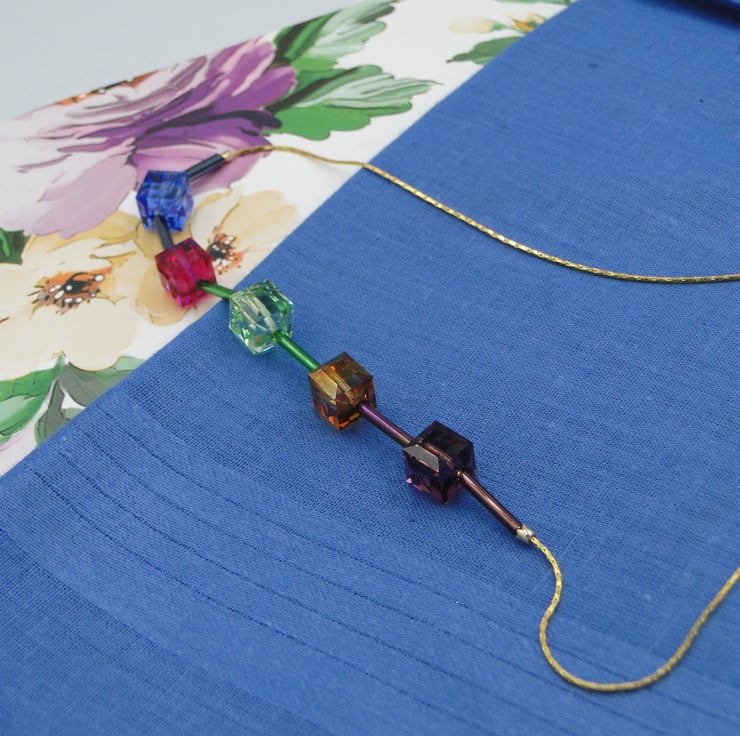 Swarovski Crystal cubes on a golden chain. Magnetic clasp. Purple, orange, green pink and blue.