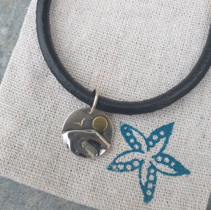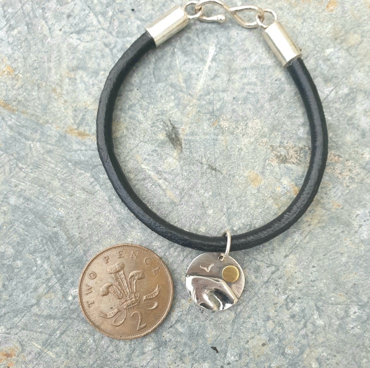 Perfect summer beach wear. This bracelet is made from 4mm black leather cord and features a sterling silver beach scene charm with a little stamped seagull and a brass sun. It has handmade sterling silver end caps and an S hook fastening.