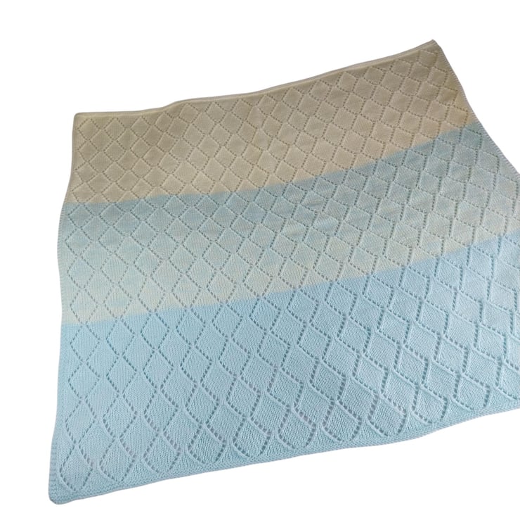 It features a delicate diamond eyelet pattern and soothing bands of blue and cream, creating a gentle ombre effect that feels calm and timeless.