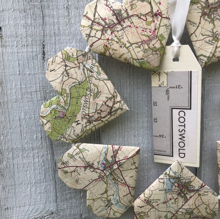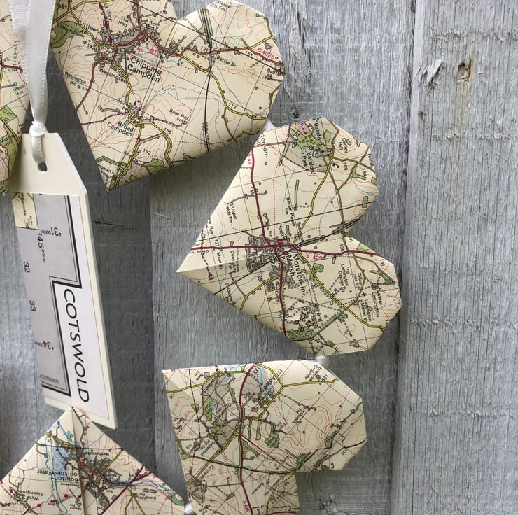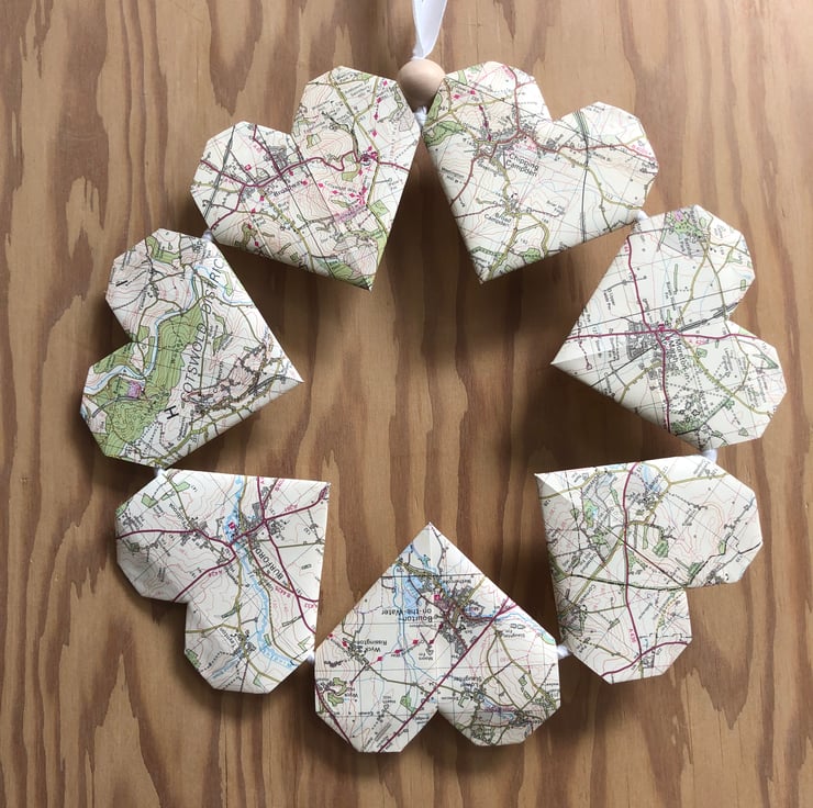 7 Origami lovehearts repurposed from an old map of the Cotswold area. The lovehearts are in beautiful natural shades of cream, white and green and are attached to a round metal wreath frame covered in an ivory ribbon. The hanging loop is in matching ivory ribbon, topped with a natural round wooden bead, allowing the wreath to be hung to a wall or a door. The metal frame measures 20cm (diameter) and the overall width of the finished wreath is 24cm (diameter). Popular Cotswold towns and villages, such as Broadway, Chipping Camden, Bourton on the Water and Daylesford, feature in the wreath. Indoor use only.