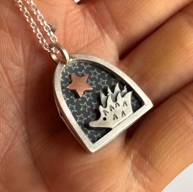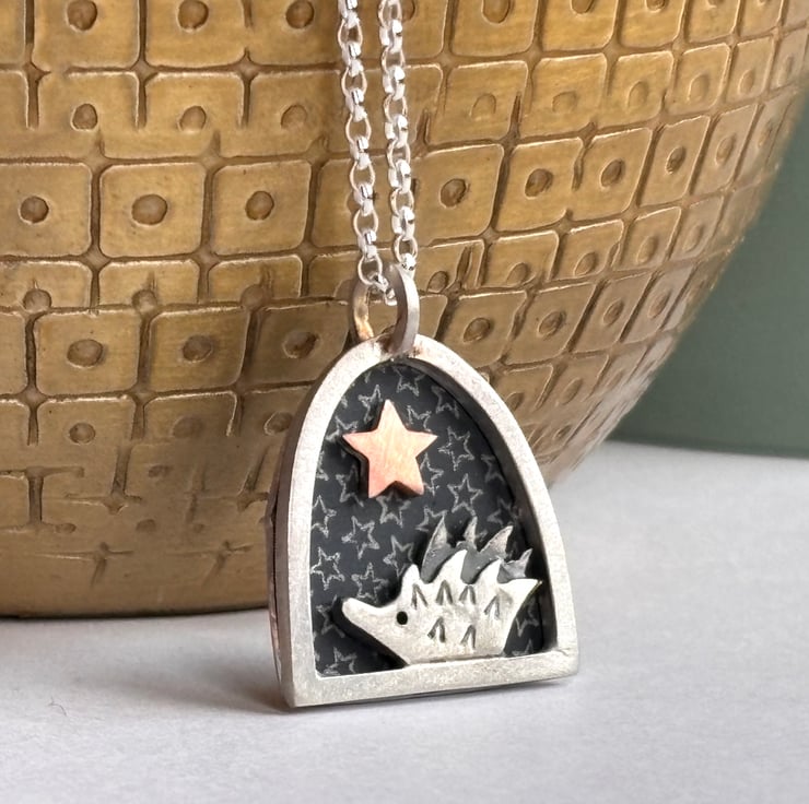 A cute pendant featuring a featuring a little hedgehog with a copper star. This necklace is made from anodised aluminium, sterling silver, and copper, and each piece has been carefully cut with a piercing saw and constructed in layers. The coloured aluminium piece is patterned with a resist and immersion dyed and the silver is textured and partly oxidised for depth. Hung from an 18 inch sterling silver chain. (Other lengths available). Please note each one is handmade from scratch so may vary very slightly from the image.