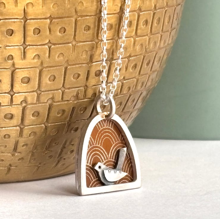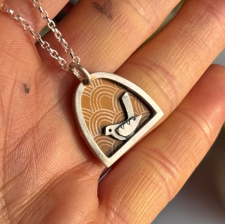 Perfect form adding a pop of colour to an outfit, this cute necklace is made from anodised aluminium and sterling silver. Each piece has been carefully cut with a piercing saw and constructed in layers. The coloured aluminium piece is patterned with a resist and immersion dyed. Hung from an 18 inch sterling silver chain. (Other lengths available, please ask).