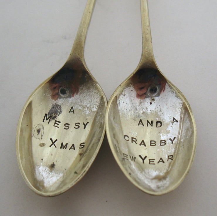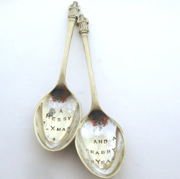 A matching pair of vintage silver-plated (well, formerly silver-plated, they are very old and worn) 'apostle' coffeespoons, handstamped respectively with A MESSY XMAS and AND A CRABBY NEW YEAR.