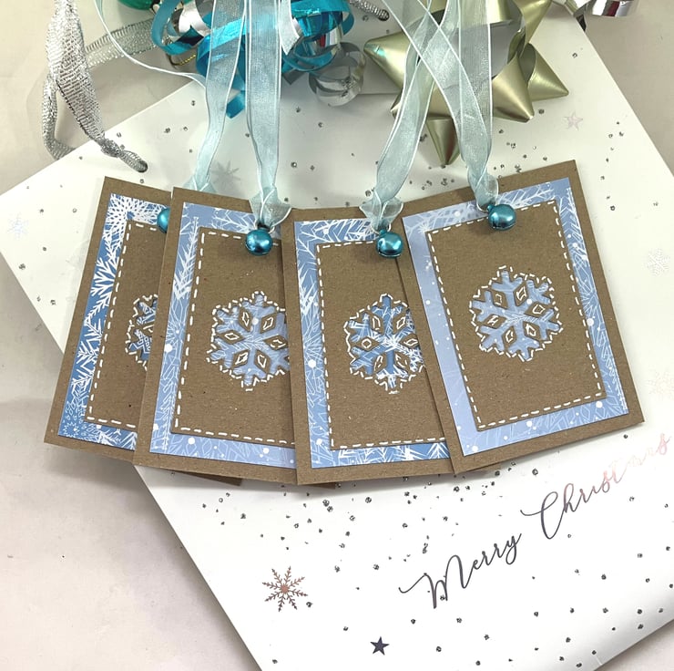 Pack of 4 Christmas gift tags, each with a snowflake cut from kraft card. The outer edge of the card and the snowflake have been given a faux stitching edging, hand drawn, in white ink. This topper has been overlaid onto a background of blue snowflake patterned paper on a rectangular kraft tag, Each tag has a jingle bell and a length of pale blue organza ribbon to attach it to your gift.