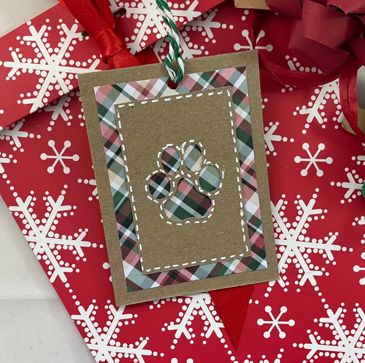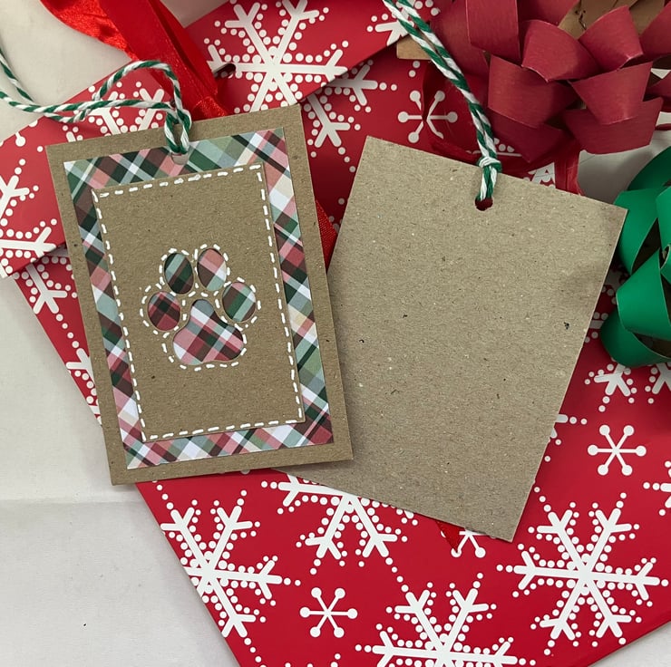 Pack of 4 Christmas gift tags, each with a paw print cut from kraft card. The paw and the outer edge of the card have been given white faux stitching. This topper has been overlaid onto a background of green and red tartan style paper over a kraft tag, Each tag has a length of green and white baker's twine to attach it to your gift.