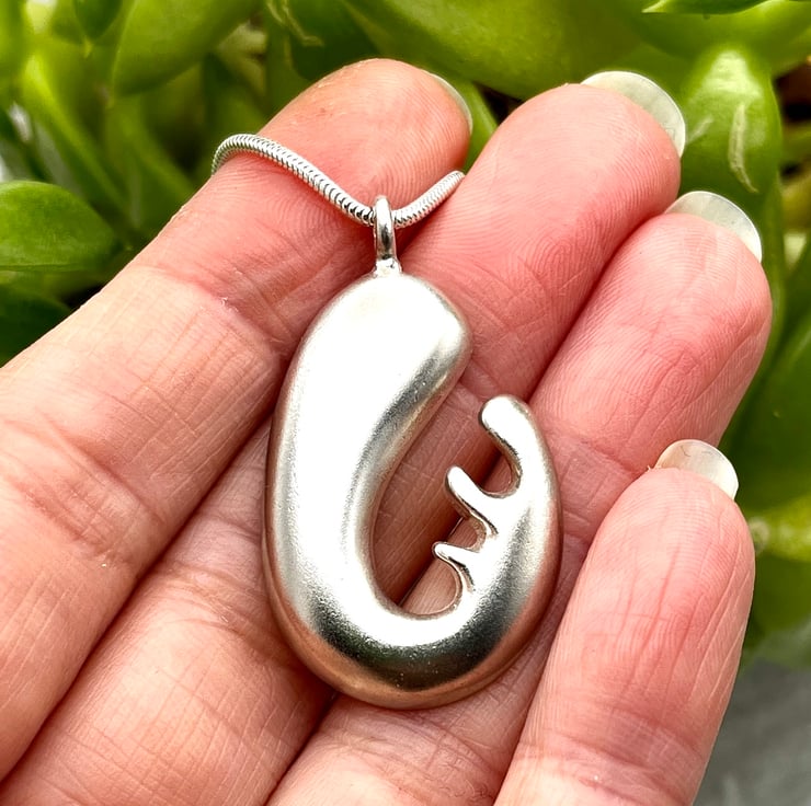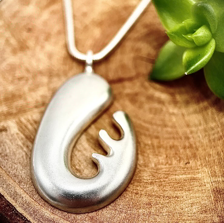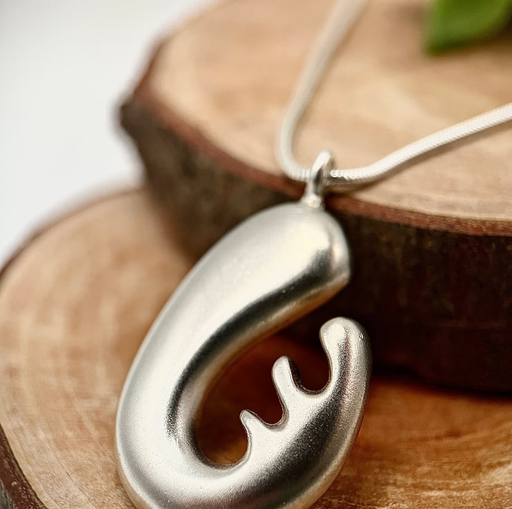 This sterling silver chunky biomorphic pendant design came from an abstract drawing of a flower. It is given a beautiful frosted matt finish. This stunning pendant hangs from a heavy 40cm (16”) Sterling silver snake chain. A stunning addition to any outfit. This piece has been hallmarked at the Birmingham Assay Office.