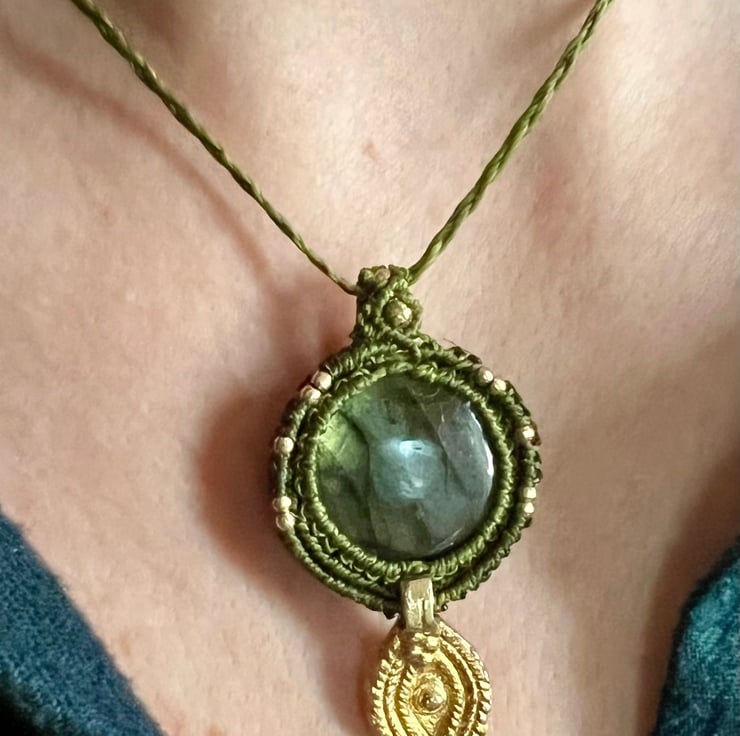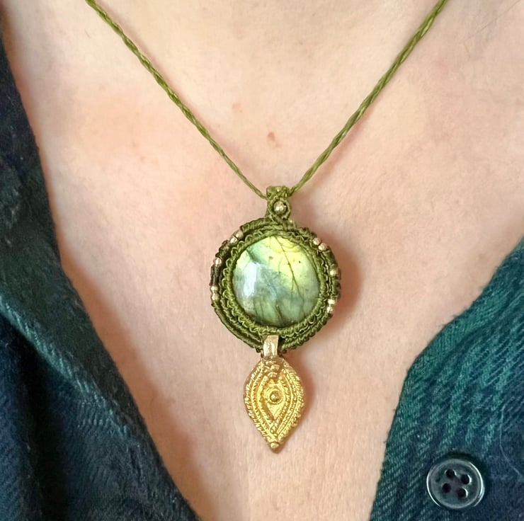 This labradorite pendant shimmers with green and blue hues, finished with a brass third eye charm — a symbol of intuition and protection. Handcrafted with love using olive-green macramé thread and golden details.