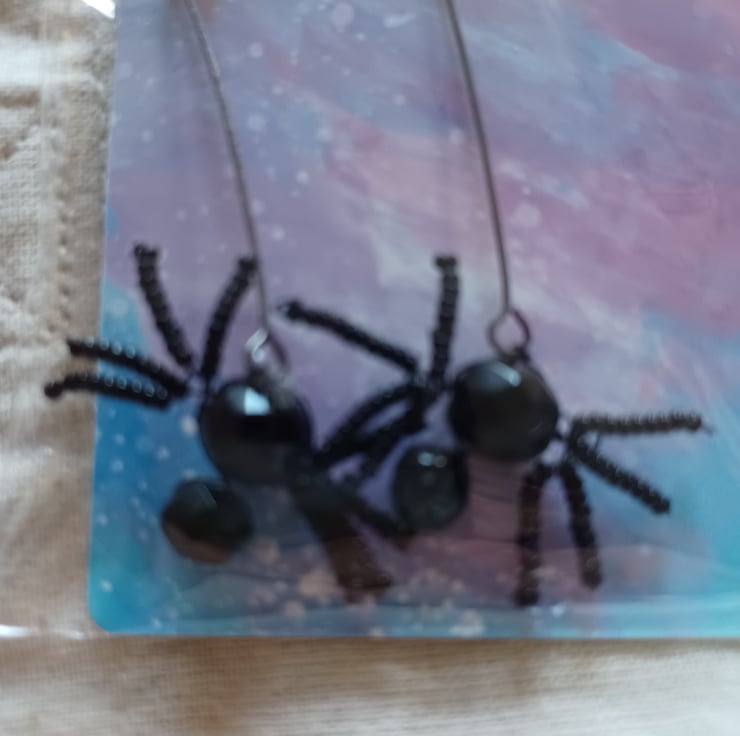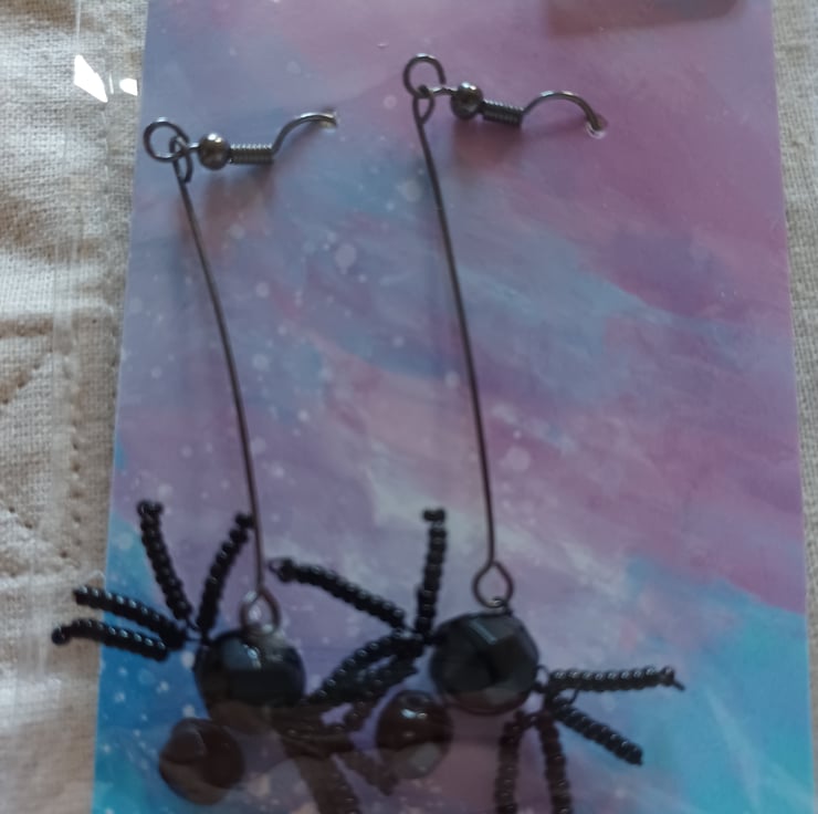 A pair of black beaded spider earrings on long webs! Each spider has two body segments and eight long black legs. The earrings are on hypoallergenic hooks and have plastic backs. Stirling silver hooks are available at an additional cost, if preferred.