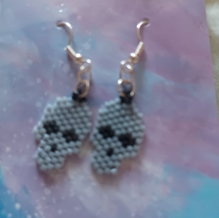 A pair of grey seed bead skull earrings made using brick stitch. Each skull has black features. The earrings are on hypoallergenic hooks and have plastic backs. Stirling silver hooks are available at an additional cost, if preferred.