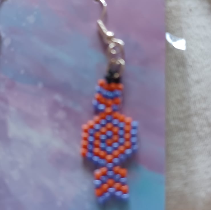 A pair of orange and green seed bead sweets earrings made using brick stitch. Each sweet is made from a purple and orange swirl.. The earrings are on hypoallergenic hooks and have plastic backs. Stirling silver hooks are available at an additional cost, if preferred.