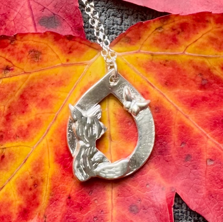 A young silver fox sits watching a butterfly in this pear drop shaped pendant.