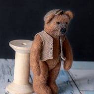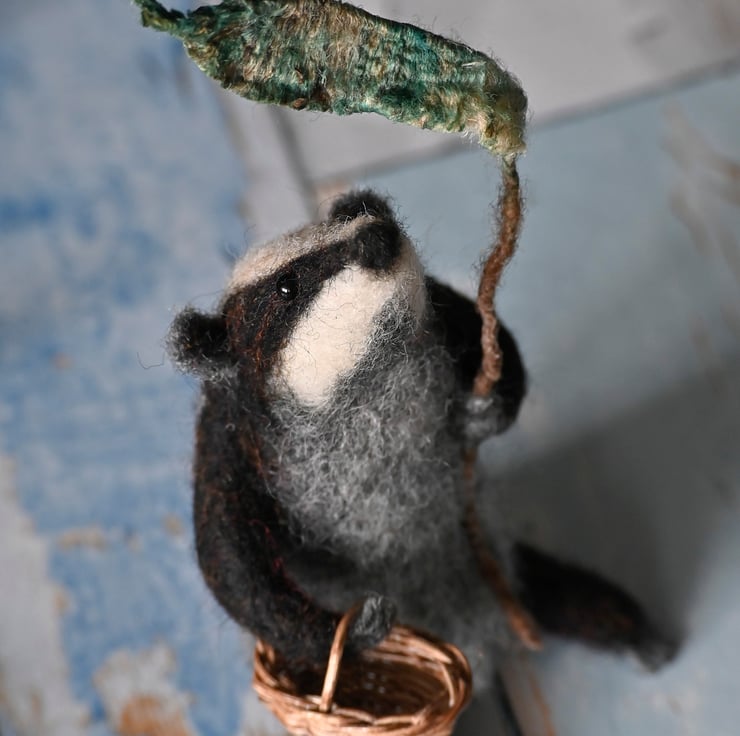 A delightful one of a kind badger. He is carrying a basket and a stylish leaf umbrella. Perfect for a day out in the woods foraging. He is prepared for sunshine or summer showers!