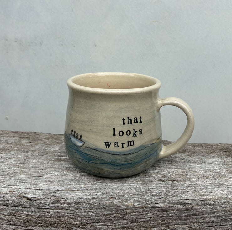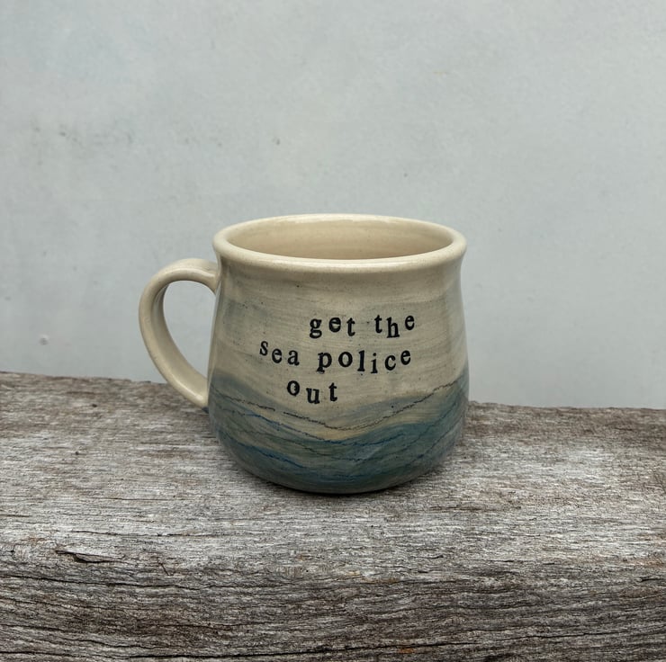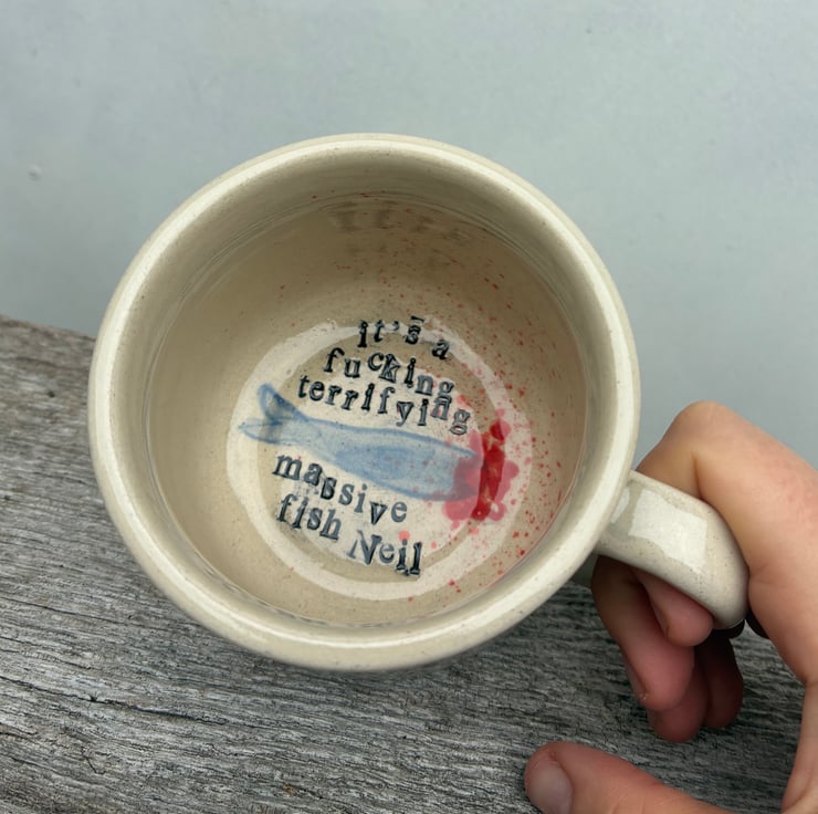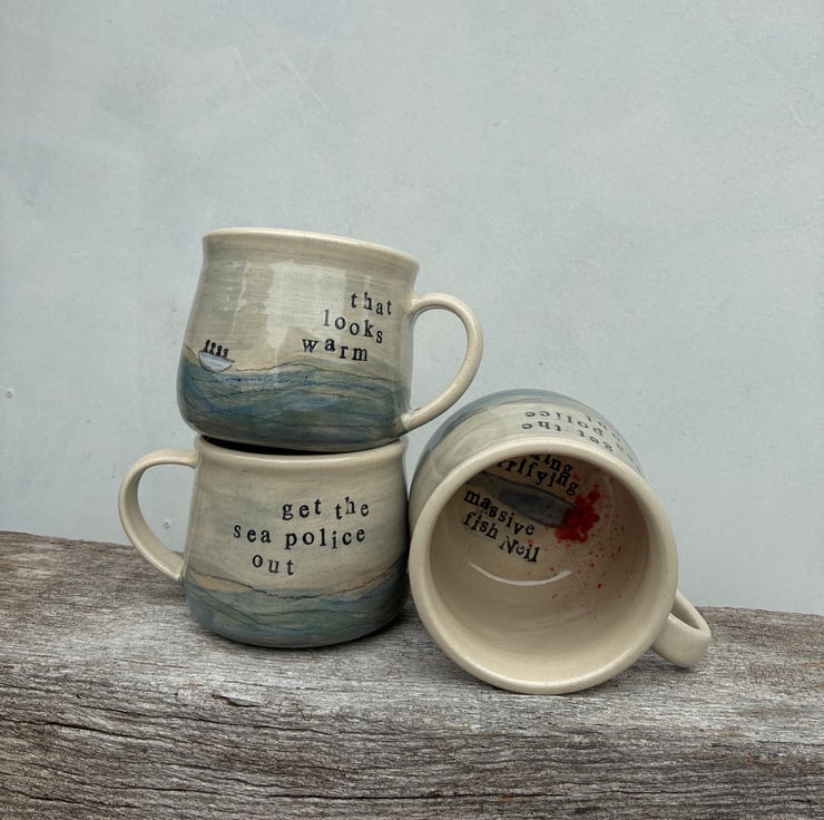 Inspired by an episode of the inbetweeners, this mug has a hand painted seascape with figures in a boat, inlaid lettering on both sides and additional lettering as well as a painted fish inside of the mug.