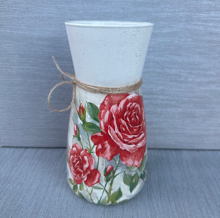 A gorgeous glass vase , painted in white and decorated using decoupage.