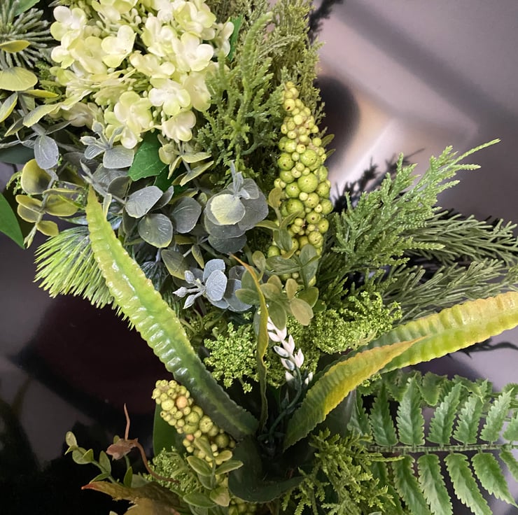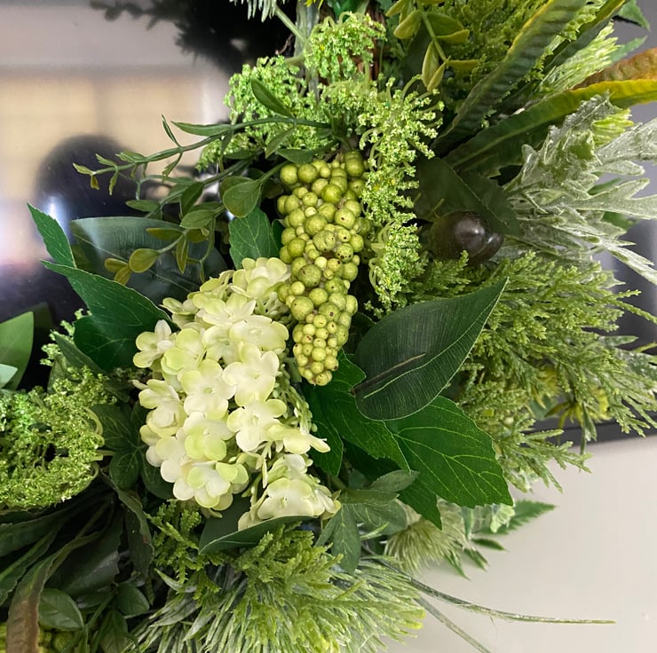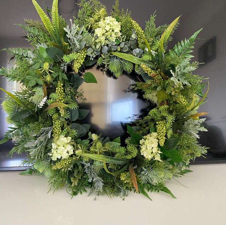 Handmade on a willow base, this artificial Christmas wreath will last year after year. Made with various different types of green foliage.