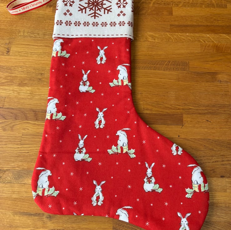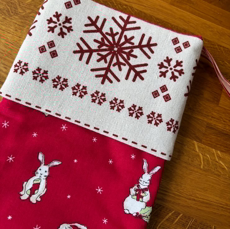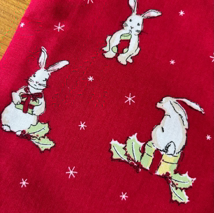 The collar is a snowflake design (scandi) and the cotton fabric is christmas rabbit with holly and presents, the lining fabric is the same as the outer fabric.