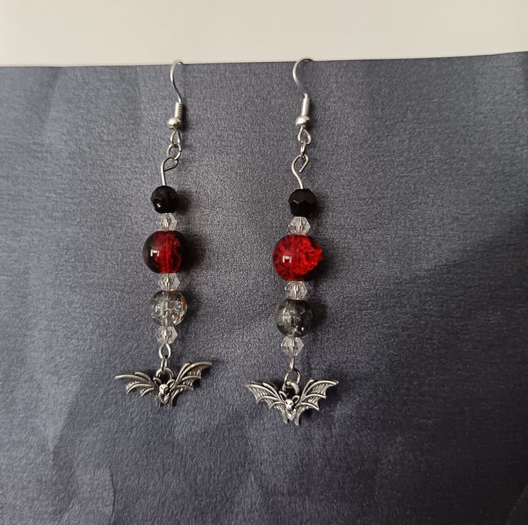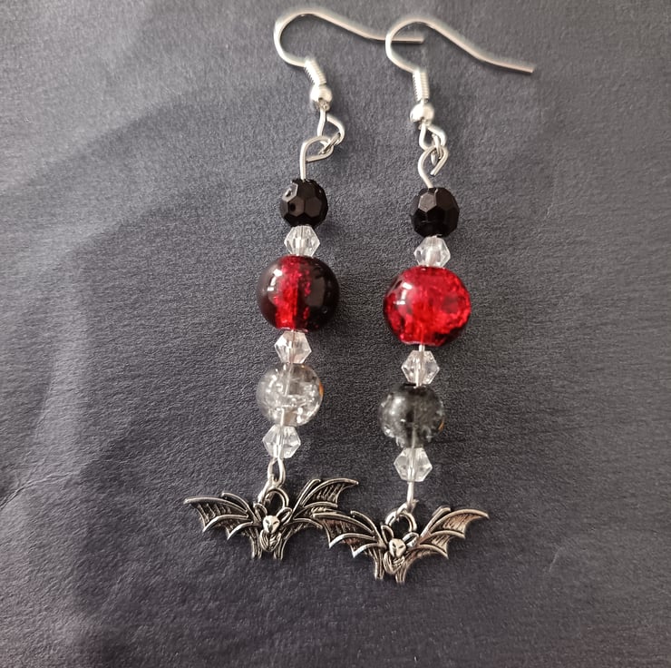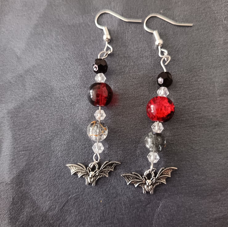 These handmade earrings are crafted with stainless steel hooks, an assortment of glass beads and sterling silver bat charms. Smaller clear beads are combined with larger red & black, charcoal grey and black beads, creating a gothic, alternative vibe.