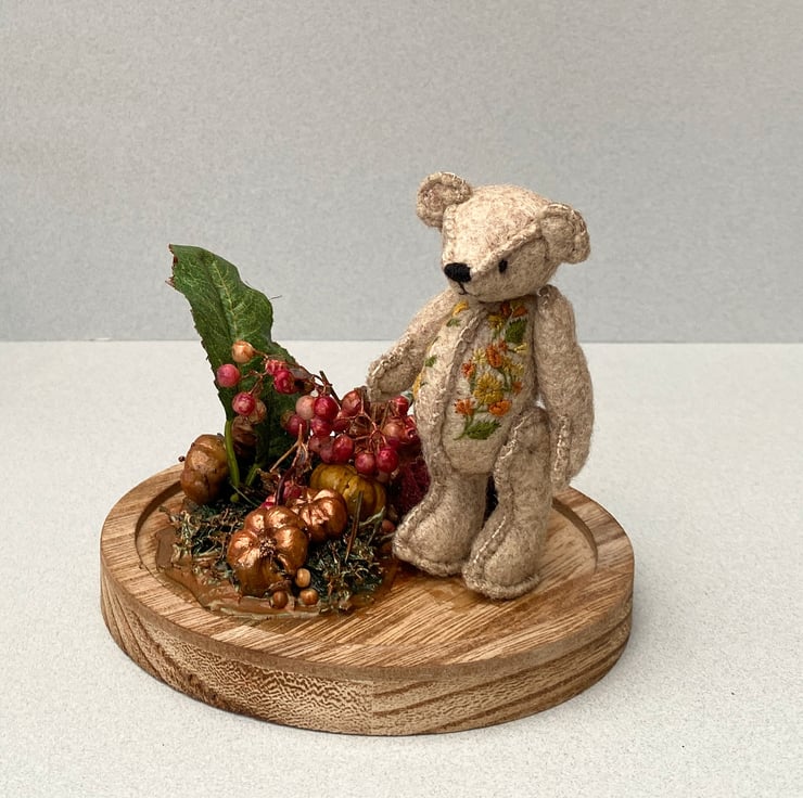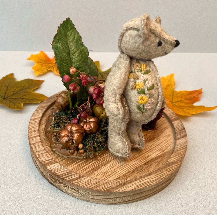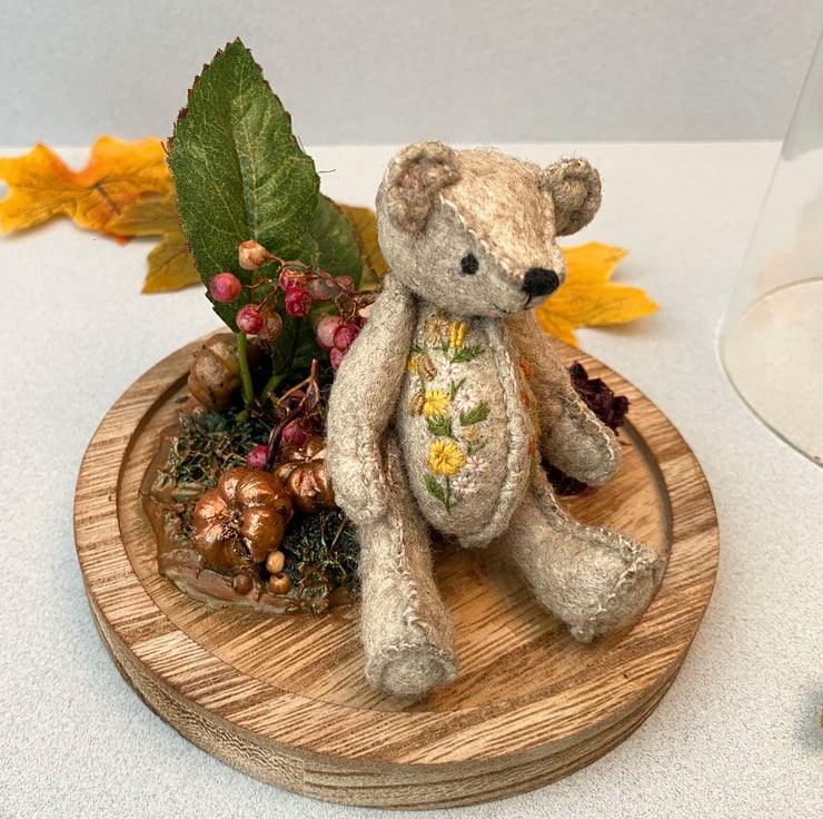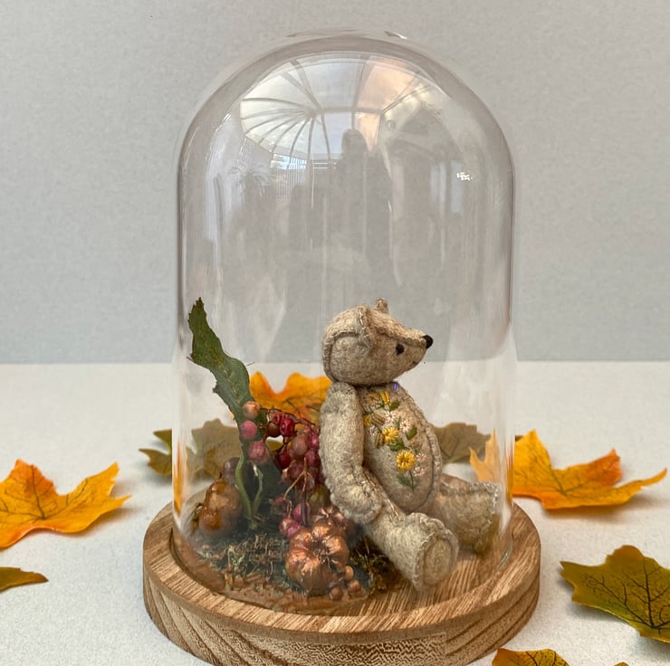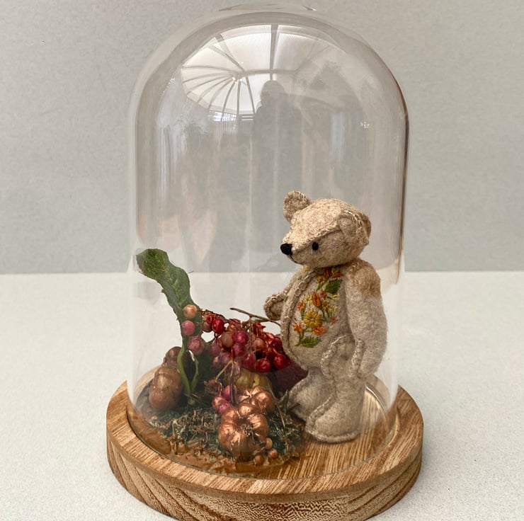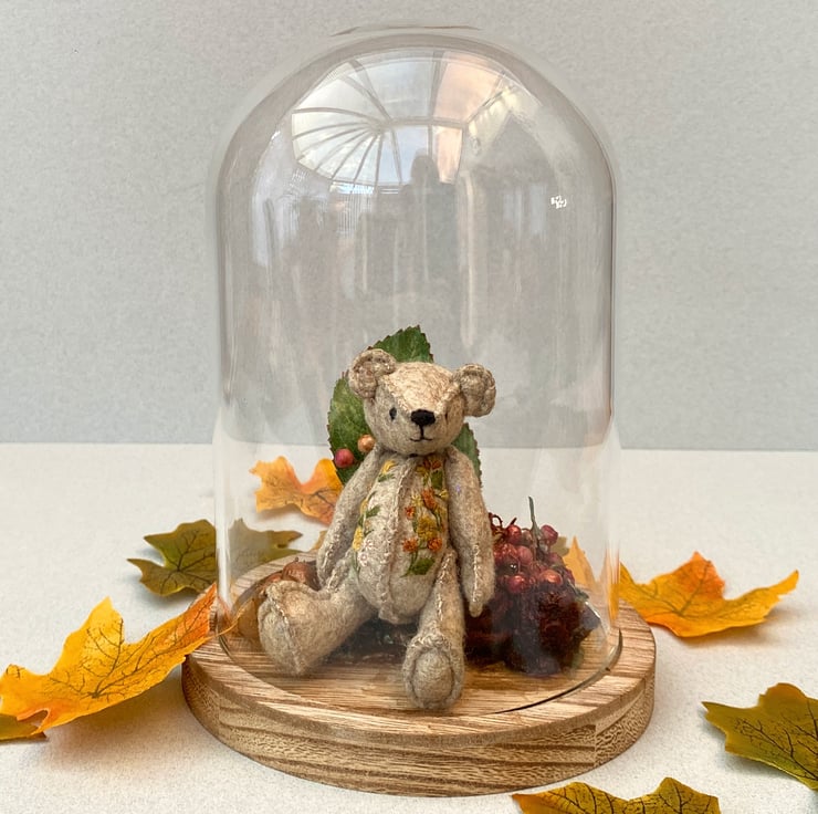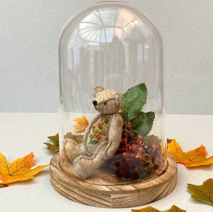 A unique design by Bearlescent. A miniature embroidered artist teddy bear sitting in a glass Cloche with an Autumn/winter display.