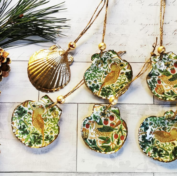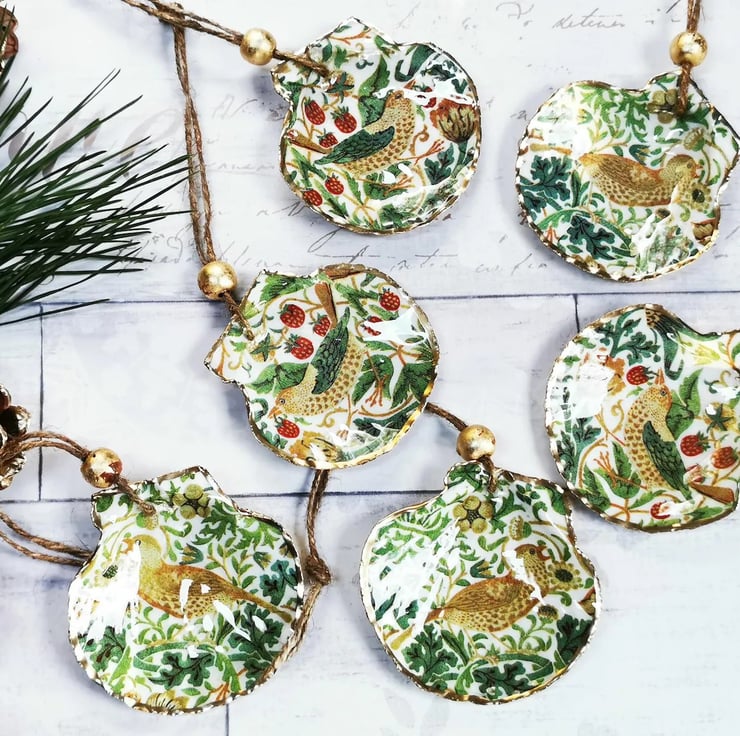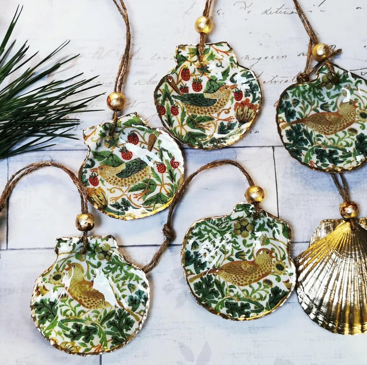 Set of six hanging ornaments, handmade from natural scallop shells and decoupaged in a William Morris Strawberry Thief design. These scallop shell ornaments are approximately 6 to 7cm wide. The backs and edges are gilded in liquid gold leaf and they are glazed in a glossy resin.
