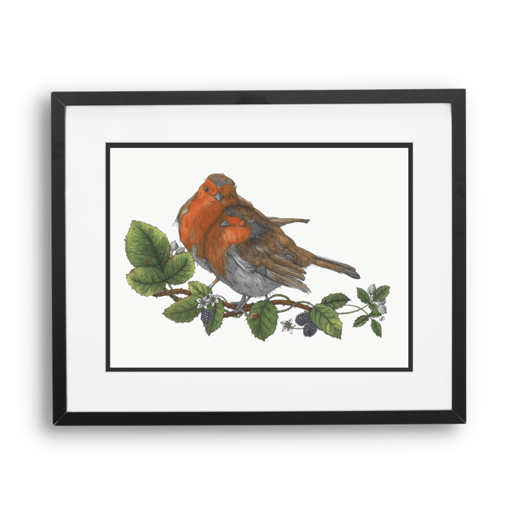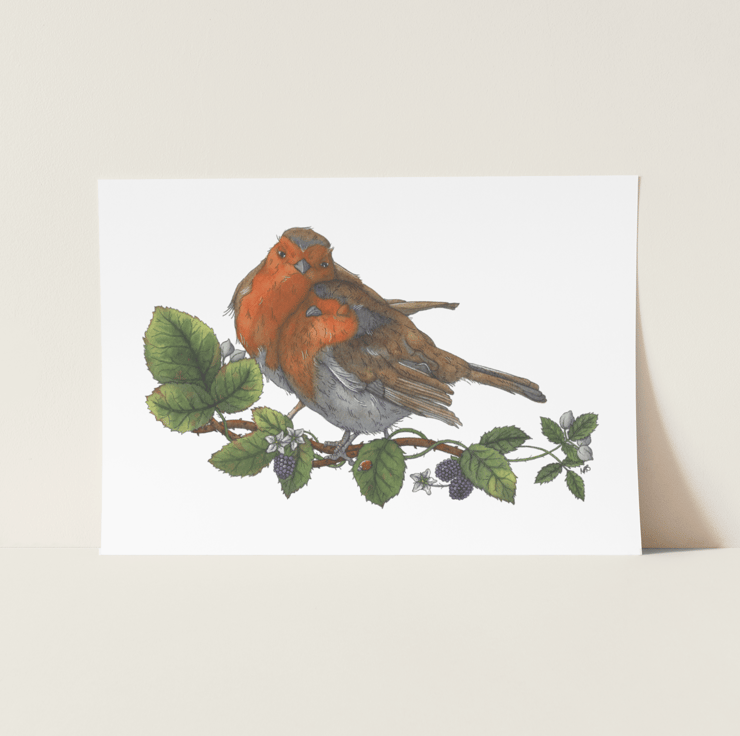 This illustration began as a secret commission — a gift from my cousin to her mum, my Auntie Barbara. All year she asked, “When are you going to paint some robins?” — not knowing her very own pair were already waiting, tucked amongst the brambles. I named them John & Barbara Robin, after my uncle and auntie. John, who we sadly lost, and Barbara, who received the painting at our girls’ Christmas party — with laughter, hugs, and a few happy tears. Their story became the heart of my festive collection: Winter is Warmer with Love — a season of gifts, memory, and quiet joy.
