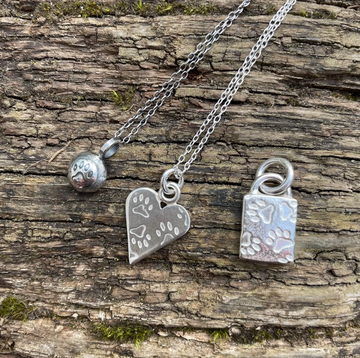 I have embossed paw prints onto a rectangle of thick silver, and added a soldered jump ring and double ring bail.