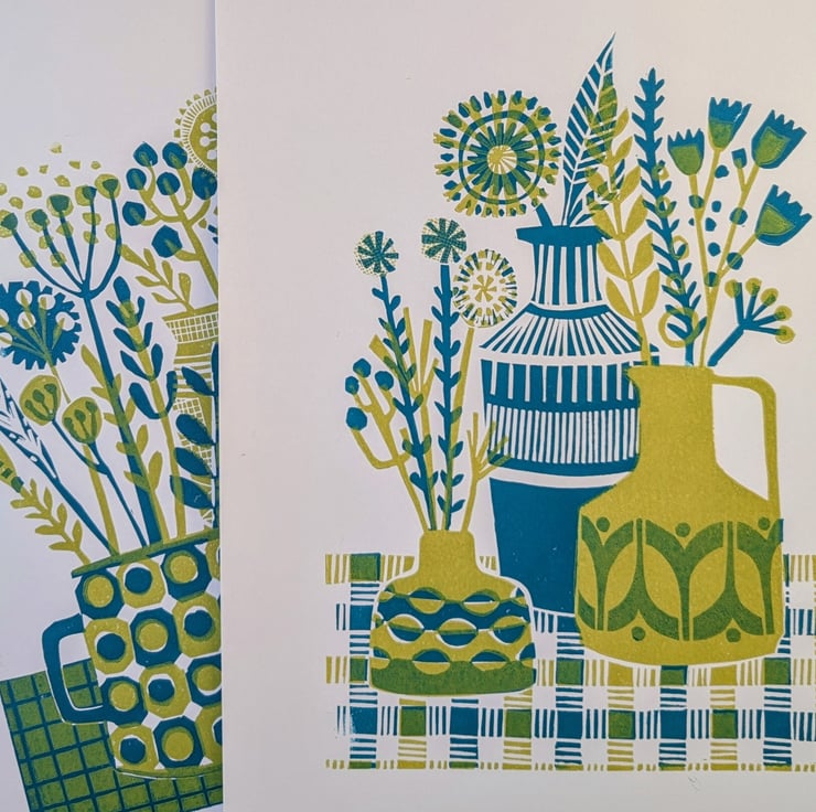 Handmade original reduction Linocut printed onto off-white 190gsm acid-free paper using gorgeous vibrant Cranfield inks inspired by my love of midcentury pottery and flowers.