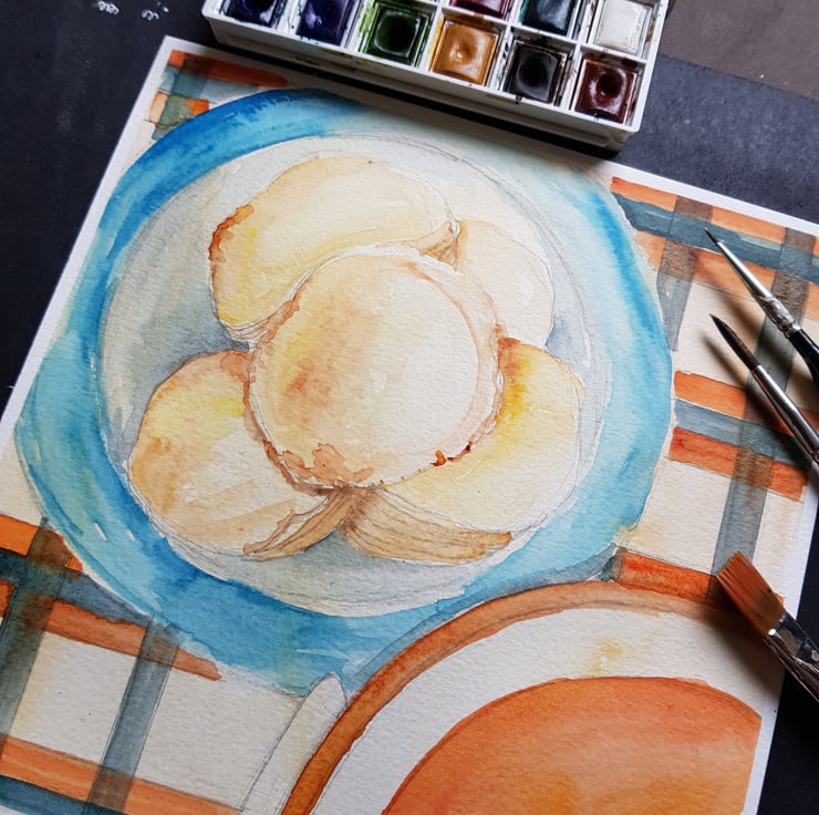 In this artwork, I aimed to capture the cosy atmosphere of an autumn afternoon when, on our return from a walk in the crisp air, we warmed up with some hot pumpkin soup and cheesy scones. The design on the blue plate was inspired by Hungarian folk art while the table cloth was inspired by the interlocking stripes of Tartan fabrics. In this listing, I included some process photos as well. This artwork will make a great addition to any kitchen or dining are if framed behind glass.