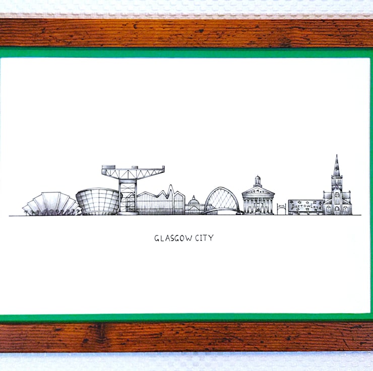 Glasgow Cityscape Handmade Unique Framed A3 Print Dark Green Border Wallart Gift
