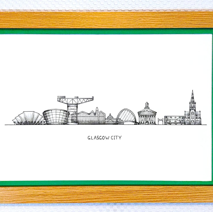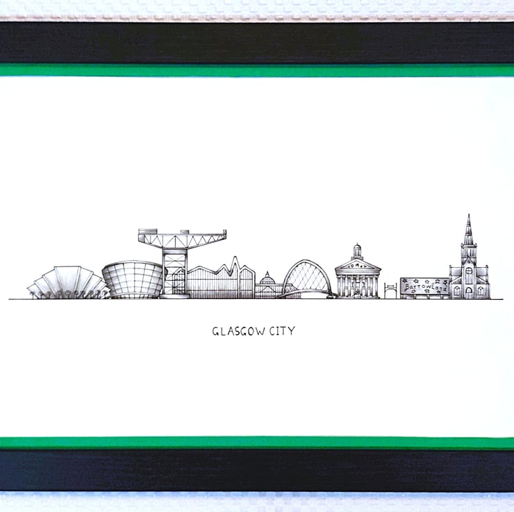 Framed high-quality shaded A3(42cm x 30cm) landscape Giclee print of a Glasgow Cityscape/Skyline. The original artwork was created from scratch, firstly by sketching out in pencel each building. After outlining the pencil work using different thicknesses of Faber-Castell and Staedtler black pigment liners each building was then shaded using the Winson and Newton promarker grey/neutral tone set. The print comes finished with a thin stylish dark green border(see shop page for all other border colours). Framed with an expensive Styrene Protective Perspex (which has same clarity of glass) ready to hang. Buyer can choose from three types of frame; Black, Oak or Dark Oak. Shades/tones of print may differ slightly due to computer/phone settings. All purchases delivered within 7-10 working days.