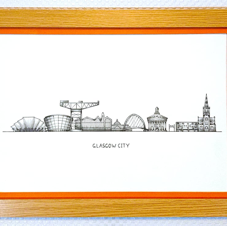 Framed high-quality shaded A3(42cm x 30cm) landscape Giclee print of a Glasgow Cityscape/Skyline. The original artwork was created from scratch, firstly by sketching out in pencel each building. After outlining the pencil work using different thicknesses of Faber-Castell and Staedtler black pigment liners each building was then shaded using the Winson and Newton promarker grey/neutral tone set. The print comes finished with a thin stylish orange border(see shop page for all other border colours). Framed with an expensive Styrene Protective Perspex (which has same clarity of glass) ready to hang. Buyer can choose from three types of frame; Black, Oak or Dark Oak. Shades/tones of print may differ slightly due to computer/phone settings. All purchases delivered within 7-10 working days.