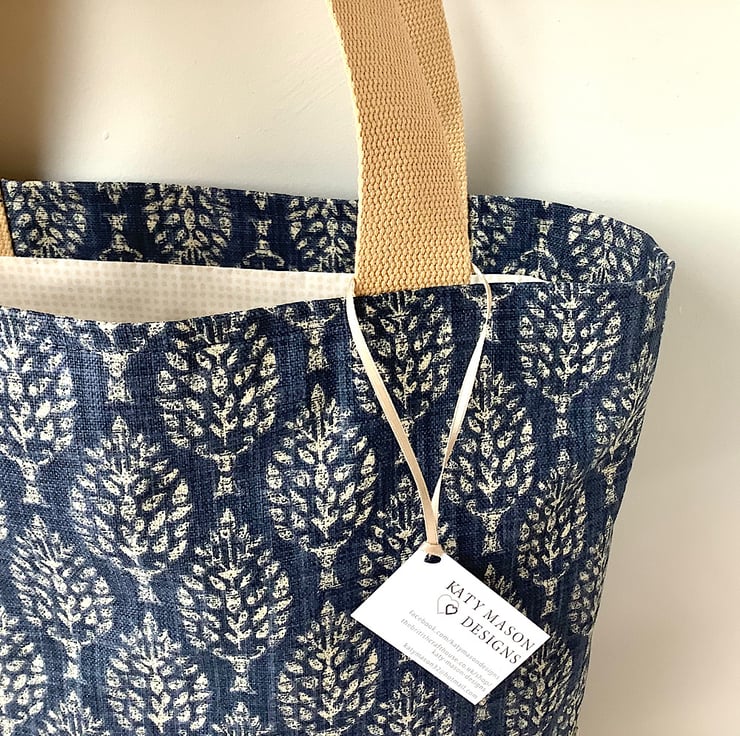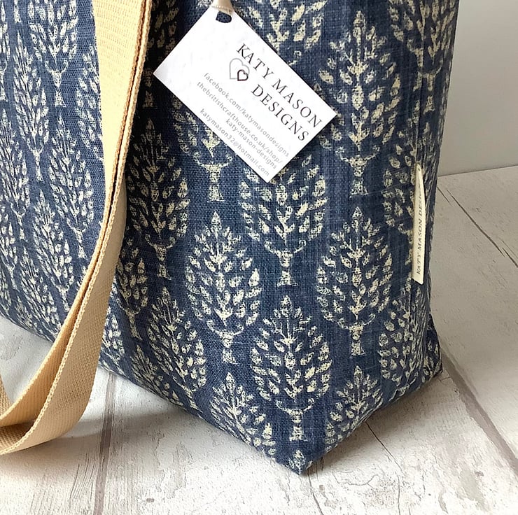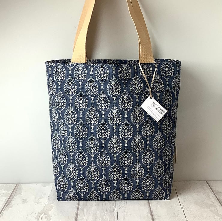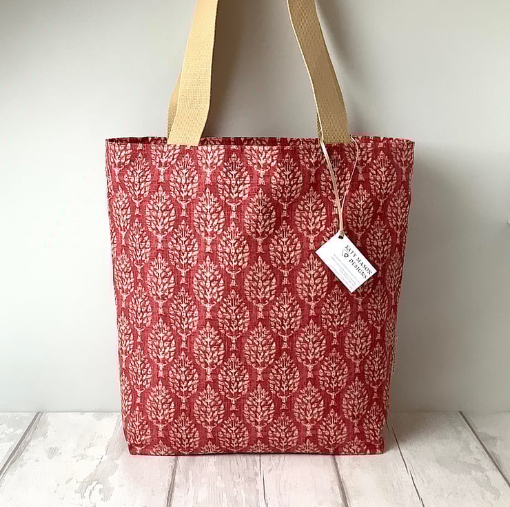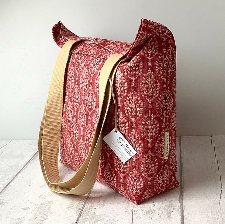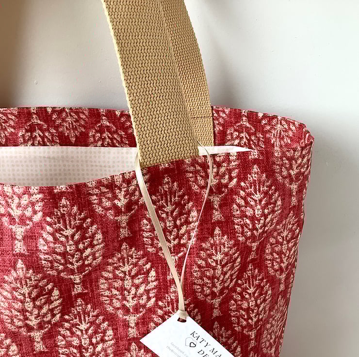 Long handled tote bag in a choice of red or blue tree print fabric. Lined in a delicate beige cotton print. Fully lined with an inside pocket. 35cm wide, 38cm high, 12cm deep. Perfect for days out, holidays, books or crafts.