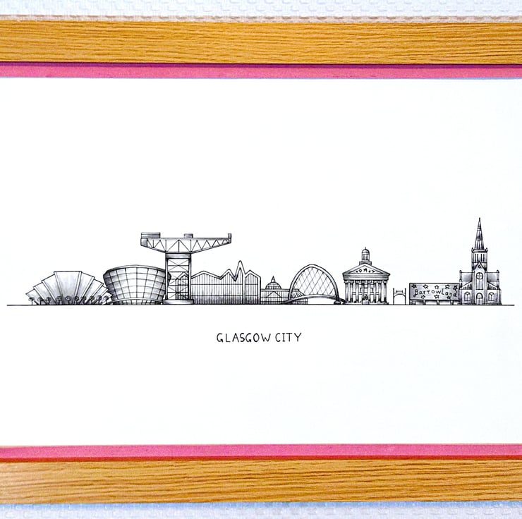 Framed high-quality shaded A3(42cm x 30cm) landscape Giclee print of a Glasgow Cityscape/Skyline. The original artwork was created from scratch, firstly by sketching out in pencel each building. After outlining the pencil work using different thicknesses of Faber-Castell and Staedtler black pigment liners each building was then shaded using the Winson and Newton promarker grey/neutral tone set. The print comes finished with a thin stylish pink border(see shop page for all other border colours). Framed with an expensive Styrene Protective Perspex (which has same clarity of glass) ready to hang. Buyer can choose from three types of frame; Black, Oak or Dark Oak. Shades/tones of print may differ slightly due to computer/phone settings. All purchases delivered within 7-10 working days.