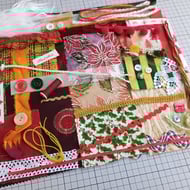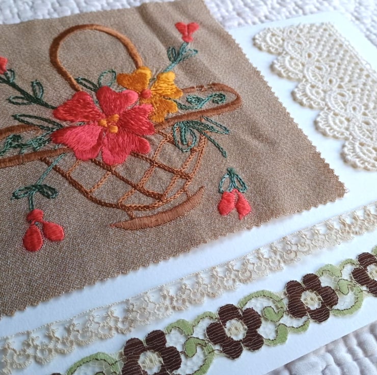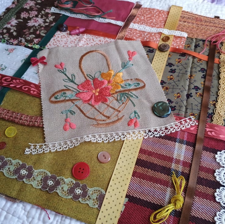 Autumn basket - the centre piece of this beautiful fabric bundle is a vintage piece with an embroidered flower basket. I've paired it up with vintage, pre-loved and factory waste textiles, haberdashery and trims in co-ordinating colours.