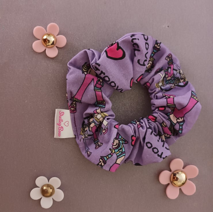 Groovy chick hair scrunchie on satin or cotton fabric. Perfect for us 90s babes who loved bang on the door as a child! Revel in your nostalgia!