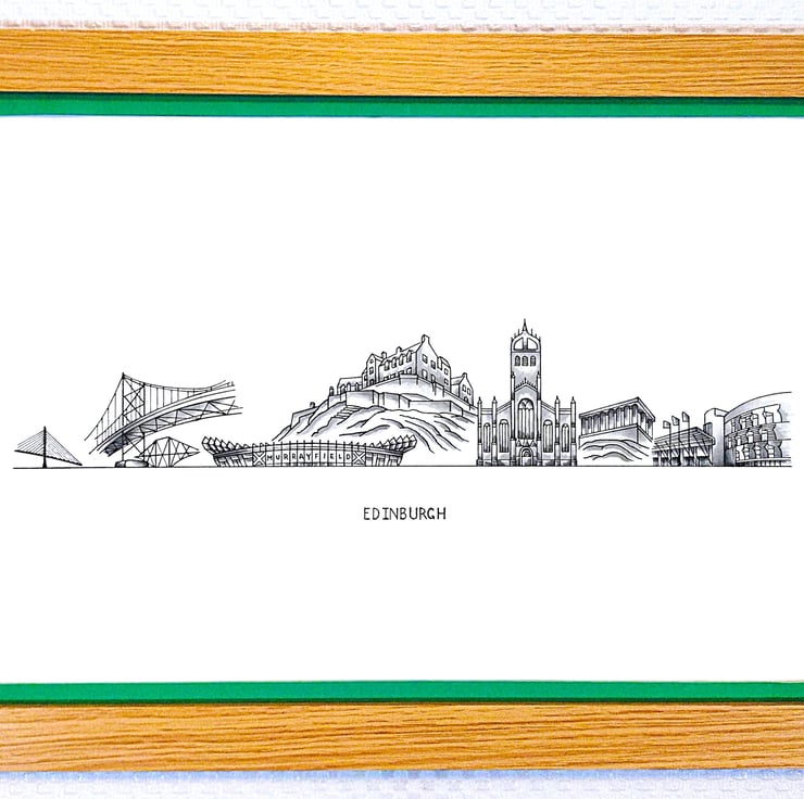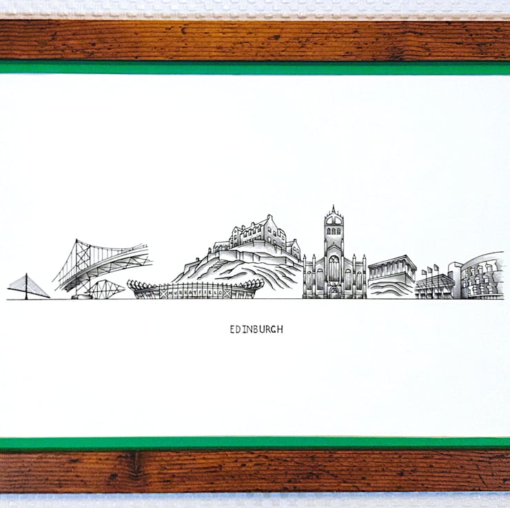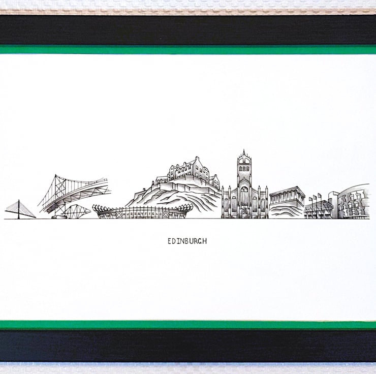 Framed high-quality shaded A3(42cm x 30cm) landscape Giclee print of an Edinburgh Cityscape/Skyline. The original artwork was created from scratch, firstly by sketching out in pencel each building. After outlining the pencil work using different thicknesses of Faber-Castell and Staedtler black pigment liners each building was then shaded using the Winson and Newton promarker grey/neutral tone set. The print comes finished with a thin stylish dark green border(see shop page for all other border colours). Framed with an expensive Styrene Protective Perspex (which has same clarity of glass) ready to hang. Buyer can choose from three types of frame; Black, Oak or Dark Oak. Shades/tones of print may differ slightly due to computer/phone settings. All purchases delivered within 7-10 working days.