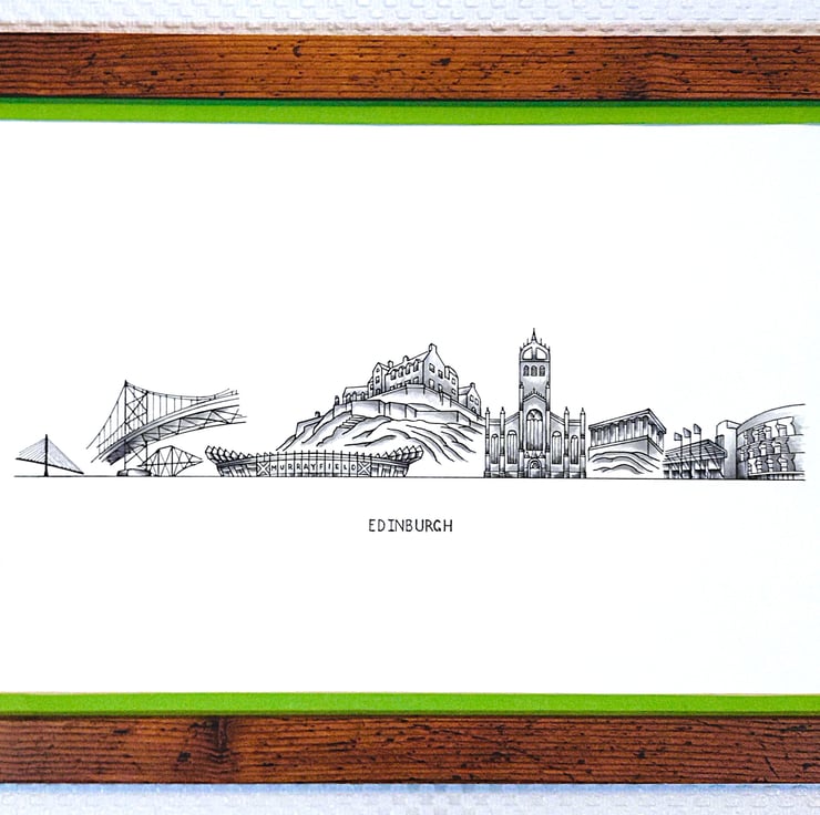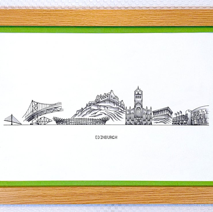 Framed high-quality shaded A3(42cm x 30cm) landscape Giclee print of an Edinburgh Cityscape/Skyline. The original artwork was created from scratch, firstly by sketching out in pencel each building. After outlining the pencil work using different thicknesses of Faber-Castell and Staedtler black pigment liners each building was then shaded using the Winson and Newton promarker grey/neutral tone set. The print comes finished with a thin stylish light green border(see shop page for all other border colours). Framed with an expensive Styrene Protective Perspex (which has same clarity of glass) ready to hang. Buyer can choose from three types of frame; Black, Oak or Dark Oak. Shades/tones of print may differ slightly due to computer/phone settings. All purchases delivered within 7-10 working days.