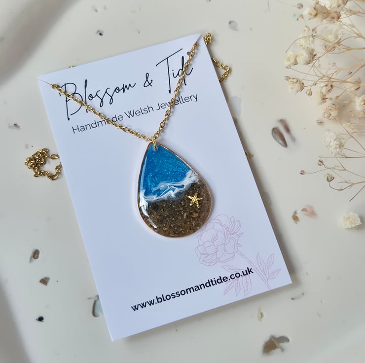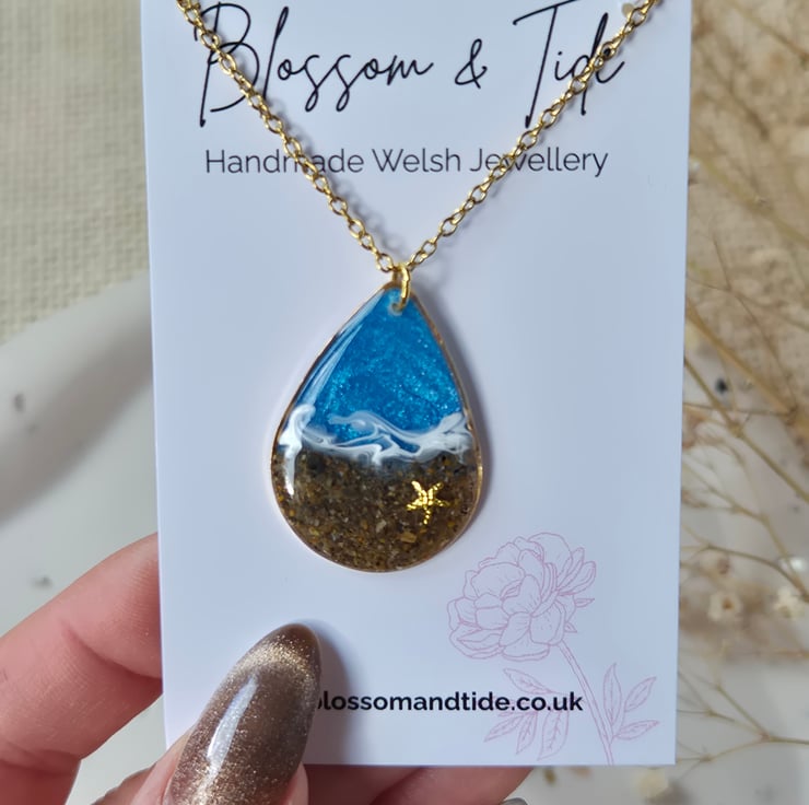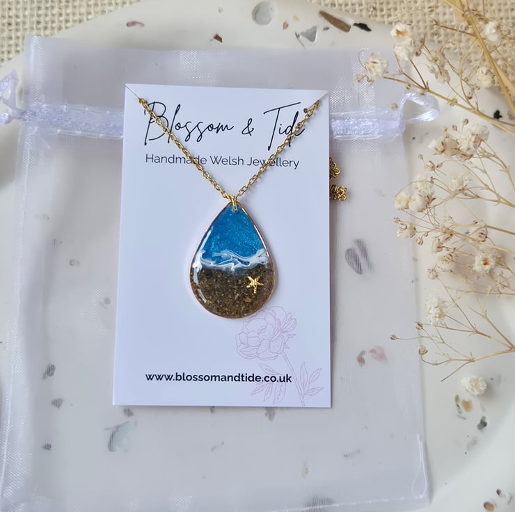 Beach Necklace with Real Welsh Sand – Ocean Resin Teardrop Pendant, Handmade