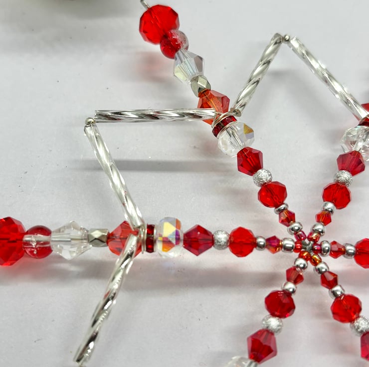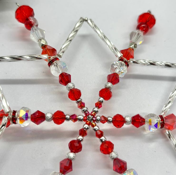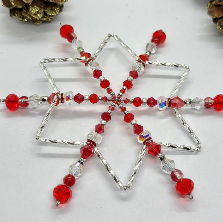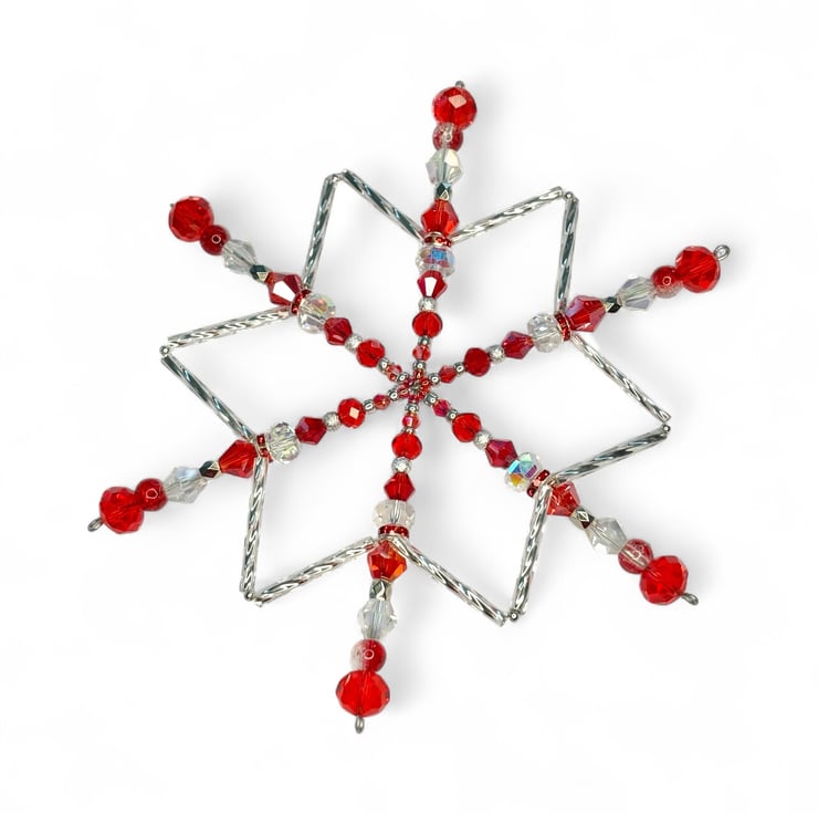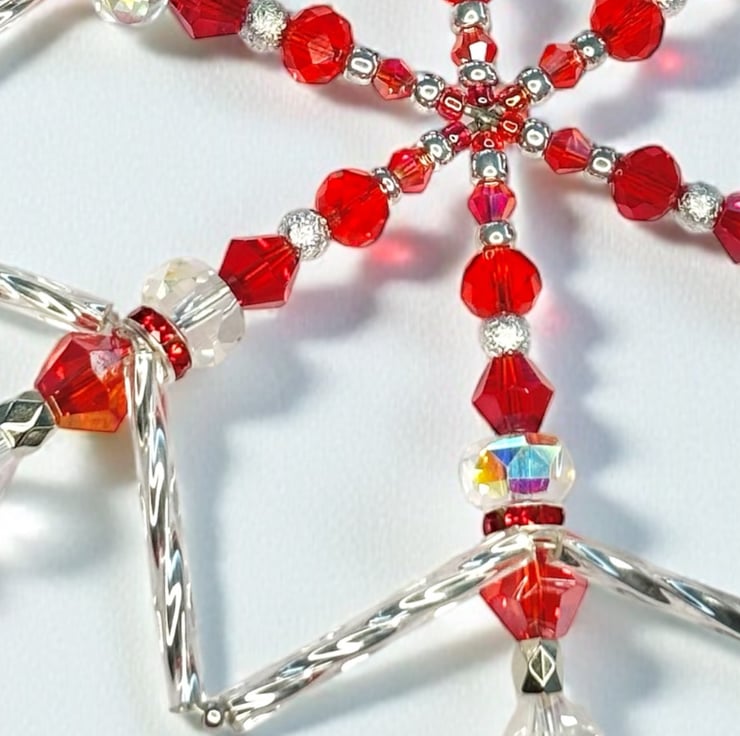 This handmade snowflake has been made using a variety of beautiful sparkling Glass Crystal beads,the main colour being bright red with sparkling clear crystal and silver coloured accents, measures approximately 14 cm in diameter and will look beautiful hanging anywhere in the house not just on your tree, they make fantastic suncatchers too, once taken down wrap in bubble wrap and lay flat preferably in a box and it will keep for years to come.