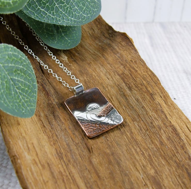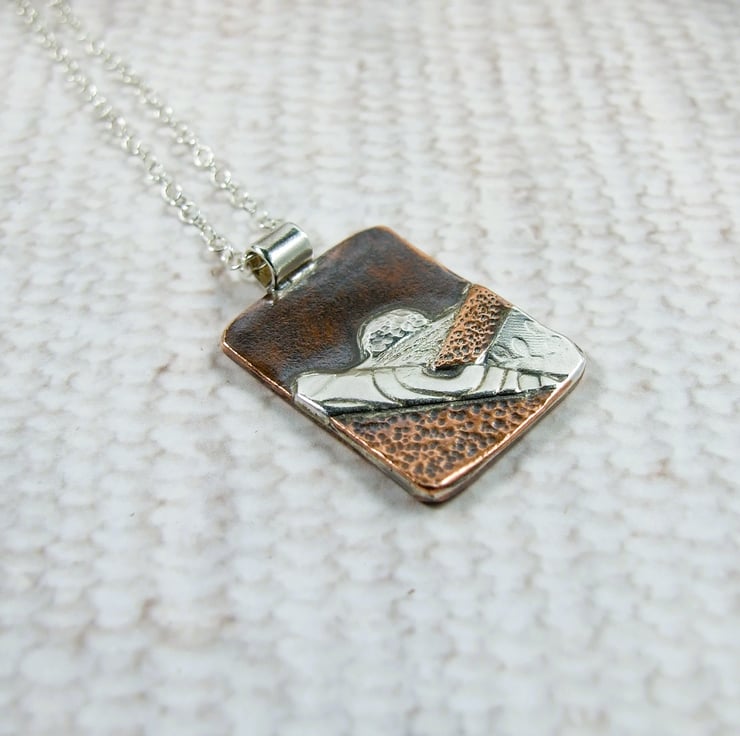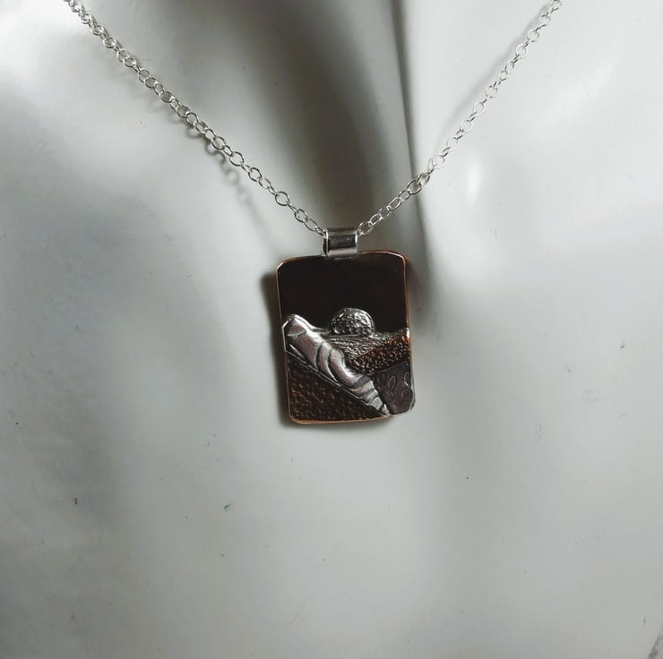 I have used copper for the base, cut from 1.2mm thick sheet. I have created a setting sun scene using copper and silver with different textures to create the seascape, both embossed and hand tooled. Unique organic style design. Fitted to an 18 inch .925 Sterling Silver chain.