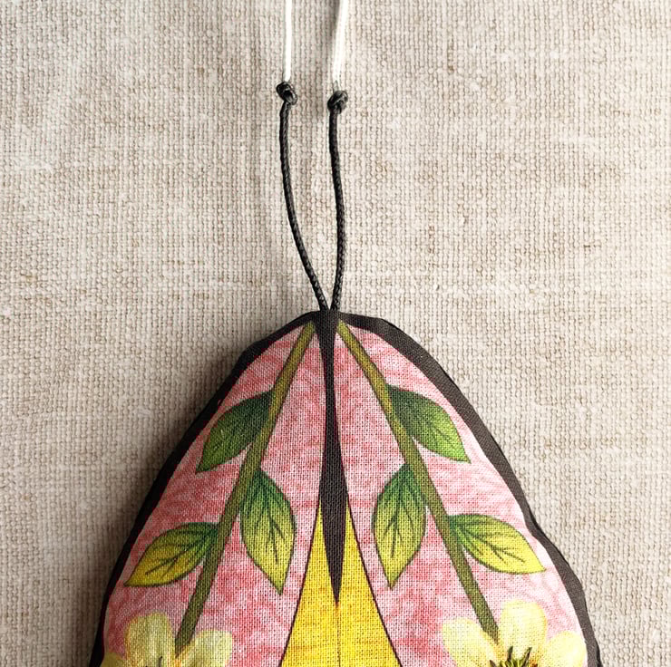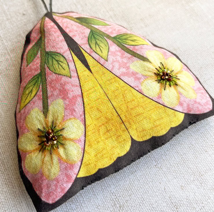 The lavender bag is my own design which I've had printed onto cotton fabric. I've embellished the wings with seed beads and embroidery threads and incorporated the antennae into the hanging loop. The back of the bag is plain black.