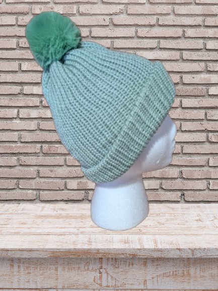 Stay cosy and stylish this winter with this beautifully crafted pale green knitted beanie hat. The chunky knit pattern features soft pale green yarn and a faux fur pom pom adding a subtle yet eye-catching detail to the classic design. The stretchy knit material ensures a comfortable fit while providing excellent insulation against cold weather. Perfect for daily wear, winter sports, or casual outings, this beanie offers versatile style that complements any cold-weather ensemble. The ribbed fold-up brim provides additional warmth for your ears and can be adjusted for your preferred fit and style. This winter accessory is an essential addition to any woman's cold-weather wardrobe, offering both practical warmth and contemporary fashion appeal.
